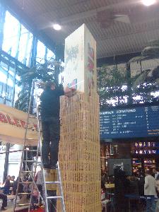 L'autre jour, la Suisse a organisé un "petit" concours entre 4 villes (Bale, Berne, Zurich et Geneve): construire une tour de tombleone de 5m.... Evidement on était là!! (Surout pour que Zurich ne gagne pas..d'jà qu'ils nous ont volé la coupe en hockey, on va pas les laisser encore gagner pour être La ville tomblerone de l'année hihi)..Bref..j'ai fait des photos...c'etait assez orginal..mais ils auraient pu engager des suisses romands pour la faire construire!! Je suis sur qu'il y a de la magouille