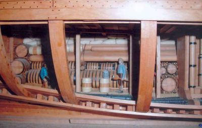 en allant jusqu'à reproduire les techniques et artifices de montage et d'assemblage du modèle d'origine, tels que mortaises et tenons, encastrements des pièces, goujons et goupilles, calfatage des ponts, fourrage des cordages…