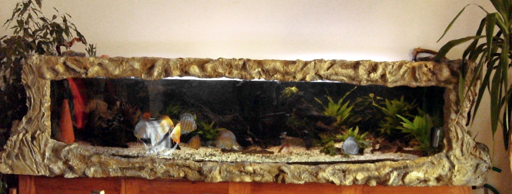 Par la conception et la fabrication de berges aquatiques la nature entre chez vous apportant une nouvelle dimension à votre espace de vie.Racines tortueuses, ruissellements de l'eau, plantes palustres et aquatiques s'harmonisent parfaitement au style de votre aquarium. Cette structure de place généralement contre une cloison, en tenant compte de toutes les mesures de sécurité.(plancher,eau, électicité, luminosité,etc)Le support principal mural est recouvers de feutre et fibre qui, grâce au pouvoir d'absorption entretiennent idéalement le degré d'humidité nécessaire pour l'épanouissement des plantations. Les reliefs,cascades, roches, falaises etc., sont réalisés avec un ciment particulier et ensuite résinés.(Photo: berge aquatique en cours de fabrication)