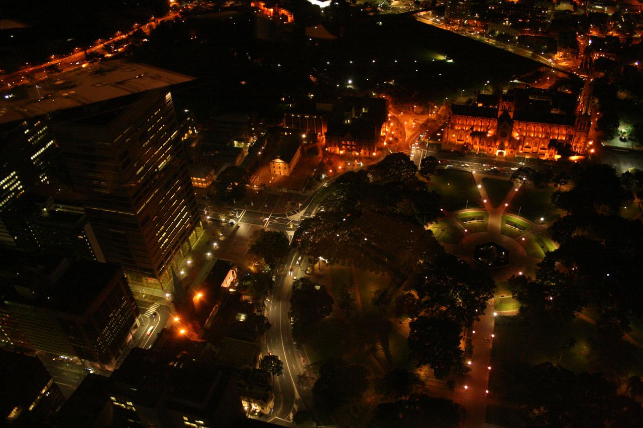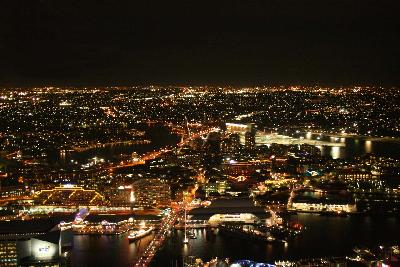 Vues du resto, en haut du centre point à 305m, le point le plus haut de Sydney, au milieu les cuisines et le buffet à volonté avec fruits de mer, charcuterie, plats en sauce, dessert... et tout autour, les tables qui font un tour à 360 en une heure et demie, de quoi admirer tout Sydney le temps de manger.