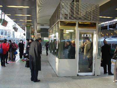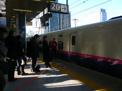 Pour notre troisième jour, nous avions rendez-vous tôt le matin à la gare de Shinagawa afin de prendre le fameux Shinkansen (train à grande vitesse) pour nous emporter vers la ville de Nikko (site classé au patrimoine Mondial de l'UNESCO) dans les montagnes. Bien emmitoufflés dans nos gros pulls, nous étions tous d'attaque sur le quai de la gare, là aussi l'attente à la file indienne était de rigueur. Nous remarquions alors les 4 rangées de voies ferrées et sentons les premières vibrations quand un premier shinkansen défile sous nos yeux sans s'arrêter. Là nous réalisons ce que veut dire "train à grande vitesse", tous les hommes fascinés commencent à aller bon train sur l'éventuelle vitesse à laquelle il peut rouler tellement ça nous a impressionné (surtout que grâce aux 2 voies du milieux, ils peuvent rouler à l'entrée d'une gare sans ralentir). Quand arrive alors un autre train s'arrêtant au quai, à peine les passagers sortis qu'une équipe de nettoyage s'attèle à remettre de l'ordre dans les wagons. Et deuxième surprise, que découvrons-nous ?!! Que les sièges tournent sur eux-mêmes électriquement. Décidément ce Shinkansen aura fait parlé de lui durant ce voyage. Une fois intallés dans le train, nous sommes en route pour 2 heures de voyage, mais la vue des paysages que l'on traverse aide sans difficulté à faire passer le temps. Soudain s'amoncellent les premières parcelles de neige (hé oui nous n'aurons été épargnés par aucun élément), et là nous sentons que les gens commencent à chercher gants, bonnet et autre petit vêtement pour lutter contre le froid. Froid qui se fera très vite sentir en sortant du Shinkansen bien (trop) chauffé. Nous prenons enuite un autre petit train pour nous conduire à 800 mètres d'altitude où se trouve Nikko. Malgré le froid, dans les transports en communs il fait toujours bon vivre grâce aux sièges chauffants (voilà sans doute la raison pourquoi les japonais dorment tous dans les transports !!)