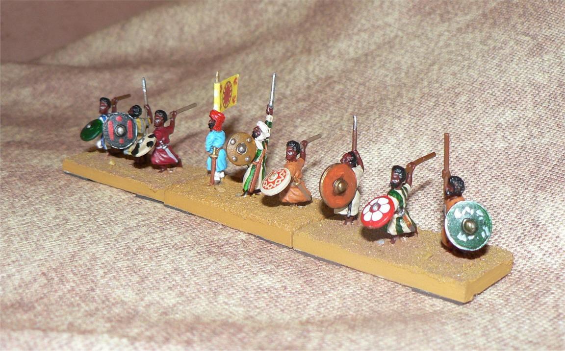 Puis l'infanterie lourde (4 figurines par socles et un socles de 1.5cm de profondeur seulement). Des lanciers égyptiens (en formation archaique avec une sauvegarde à 5+ mais un moral aggravé 2)