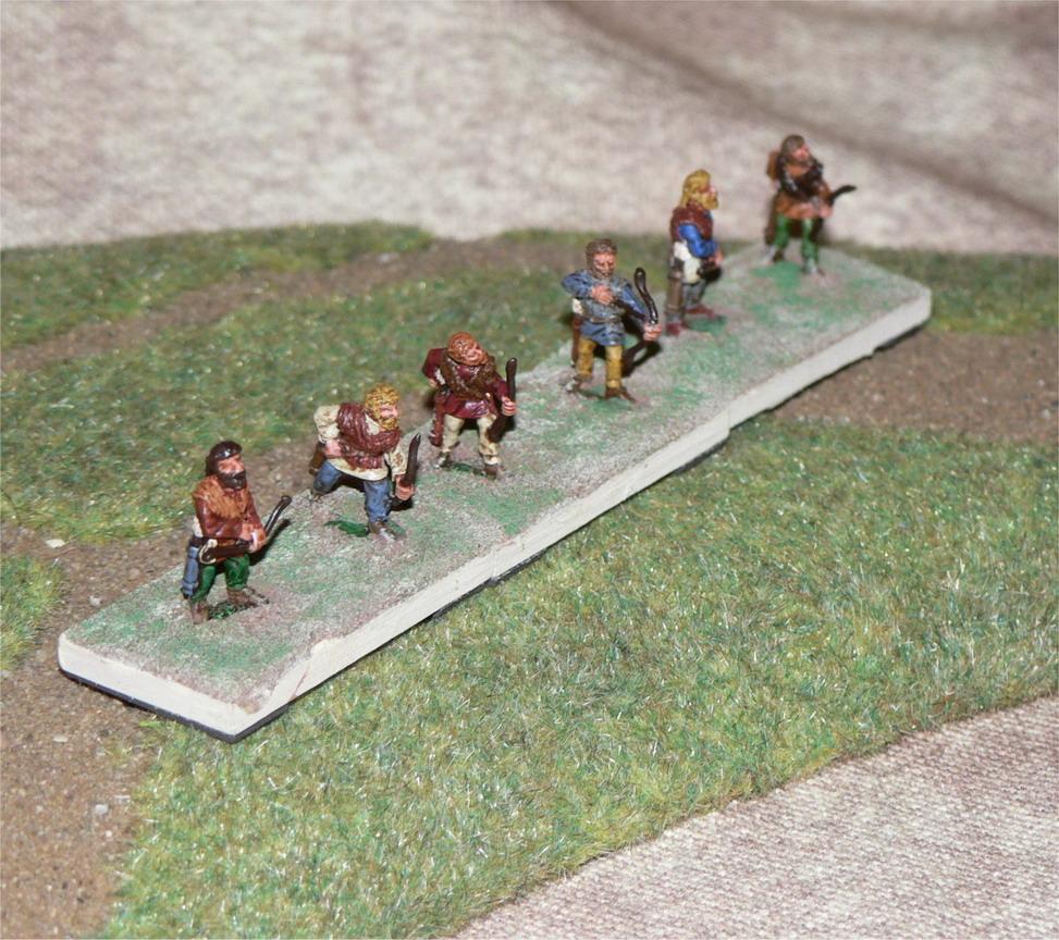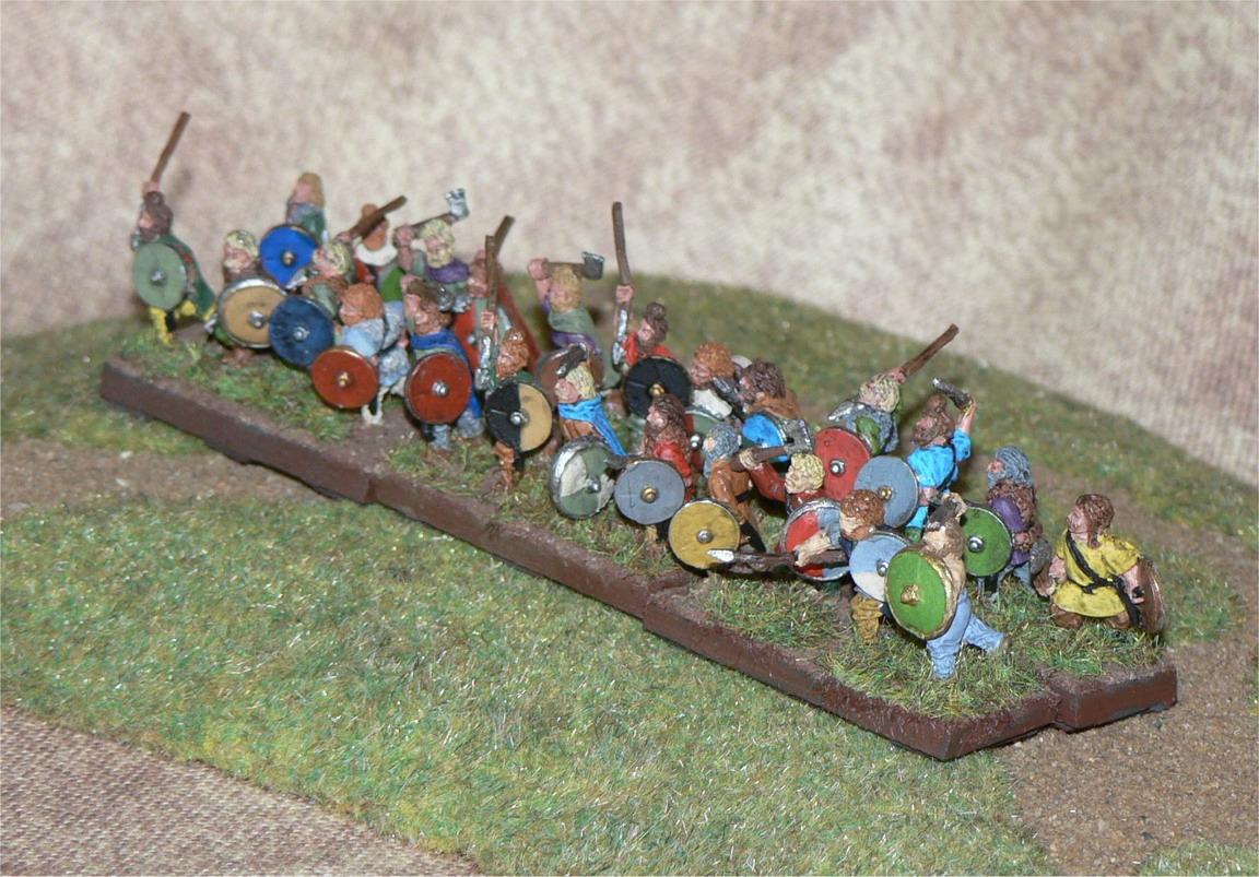 Figurines Old Glory. Cette marque permet, avec ses nombreuses références de barbares (Francs, Germains tardifs et autres) d'avoir dans une unité une belle diversité de poses.