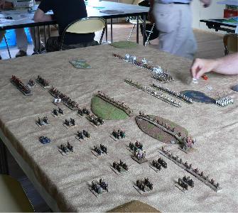 Samedi dernier, l'après-midi et la soirée ont été bien occupées, la première avec 2 parties DSC, une armée Romaine République contre une armée Bactriane et une touche d'exotisme avec une rencontre entre Chinois Hans et des Hsiung-Nu ainsi qu'une démo Volley & Bayonet avec comme thème la bataille de Razyn entre Français et Autrichiens.