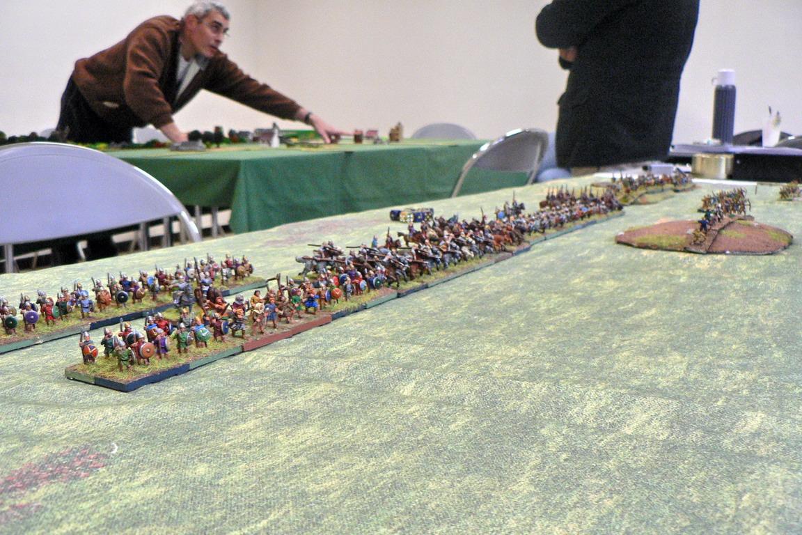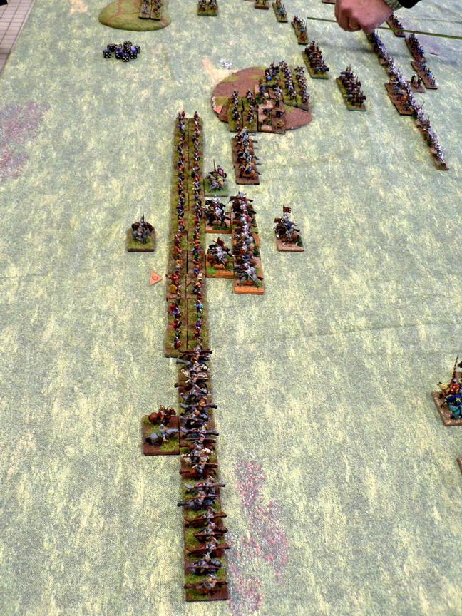 Bruno gagne l'initiative mais rate une bonne partie de ses ordres et donc avance peu, j'en profite pour avancer mes unités de tirs afin de casser sa masse. Si ces tirs occasionneront peu de pertes (1 ou 2 socles en fin de partie), ils auront sur mon aile faible une bonne efficacité pour faire reculer ses unités et les mettre en désordre (Bruno a eu peu de chance au dés de ce côté).