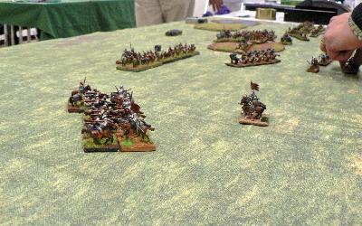 Pendant ce temps au centre, j'avance mes deux unités de Caballarii (cavalerie lourde) et malgré les tirs, les envoie charger l'infanterie ennemie. Si le premier tour de combat est à mon avantage, j'ai le tord de vouloir être trop gourmand et le second round se transforme en hécatombe de mes cavaliers : il n'en restera qu'un seul socle.