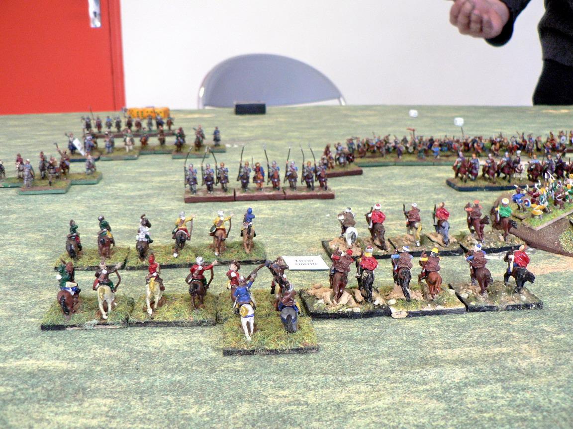 Son aile droite, 2 cavaleries lourdes (arc, lance, discipline de tir) et 2 cavalerie légère, ici en colonne et qui ne se sont pas déployées faute d'ordre réussi. En face, la cavalerie Alain chargée de les retenir.