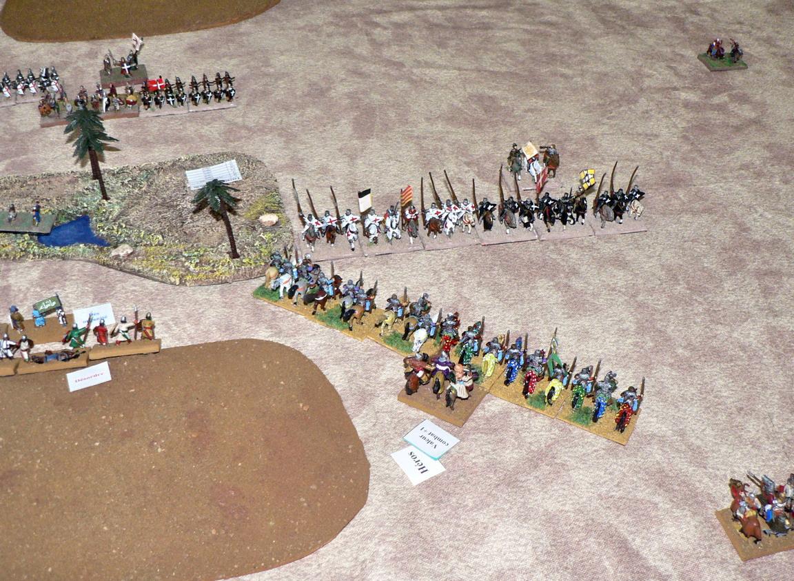 Vue d'ensemble des terrains et placement des corps après mon premier mouvement (j'ai aussi acheté l'initiative avec les points de reconnaissance restants). Les deux corps des généraux en chef se font face au premier plan. On distingue côté arabe, en avant les Seldjoukides, derrière 2 groupes de 2 unités de Mamelouks directement sous les ordres de mon commandant en chef, et plus au centre, 2 cavalerie d'askars avec un général de cavalerie indépendant. Côté croisé, Bruno qui possède bien plus d'unités à eu du mal à tout déployer et une grande partie de sa cavalerie est en colonne faute de place.