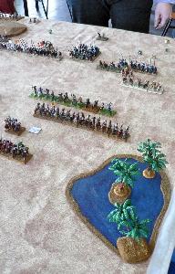Le centre arabe, 2 unités d'archers légers Arméniens et 4 unités d'infanterie moyenne dont 2 avec ténacité 1 qui permettent de moins subir les tirs. Pour l'instant, la portée des armes n'autorise aucun tir, il faudra soit que le chrétien s'approche, soit avancer dans la palmeraie.