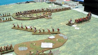 Au centre, la légion romaine commandée par le tribun ne peut pas trop s'avancer afin de ne pas exposer son flanc au corps de cavalerie et subit le tir des frondeurs des Baléares et des cavaliers numides qui régulièrement vont la faire reculer et mettre en désordre sa première ligne.