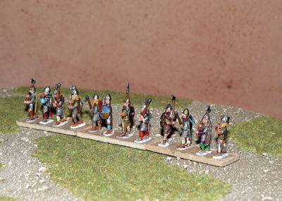 Le cavalier et le chef à pied sont des Essex, le cheval est de marque inconnu, les guerriers sont des Feudal casting et le musicien est de marque Outpost Wargame.