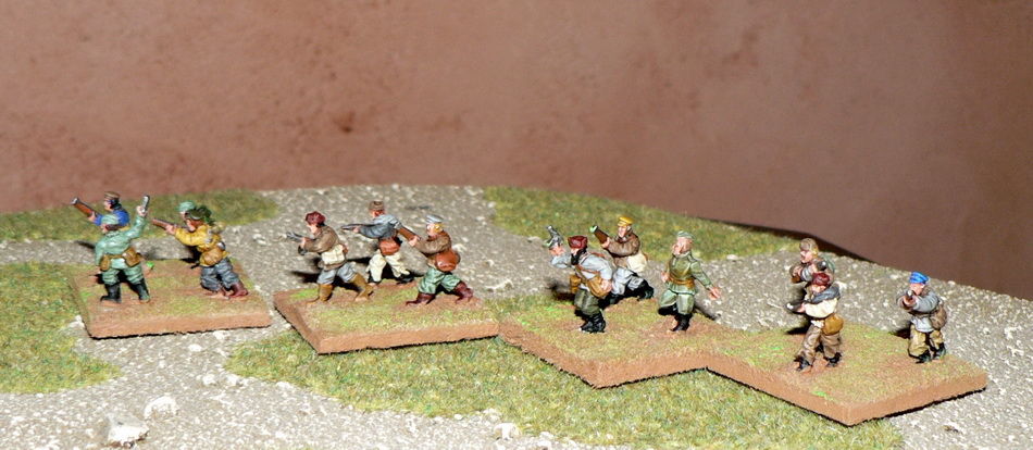 Un groupe de partisans soviétiques, mon deuxième. J'ai utilisé tout ce qui me restait de figurines qui pouvaient faire l'affaire, on trouve donc des figurines Eureka, Peter Pig, deux Old Glory (dont l'ATR), et même un marin de chez Flames of War. Par contre les Eureka plus grandes et larges ne se mixent pas avec les deux autres, donc je les ai mises ensemble sur trois socles.