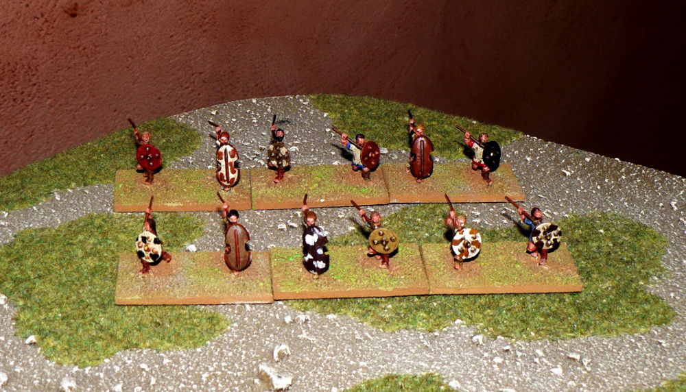 Deux unités de javeliniers. Ca y est, pour la campagne de la rentrée (Bretagne Vème-VIème siècles), j'ai ce qu'il faut en unités légères, archers et javeliniers pour cette armée. Par contre, y'a encore du boulot côté hordes de guerriers.
