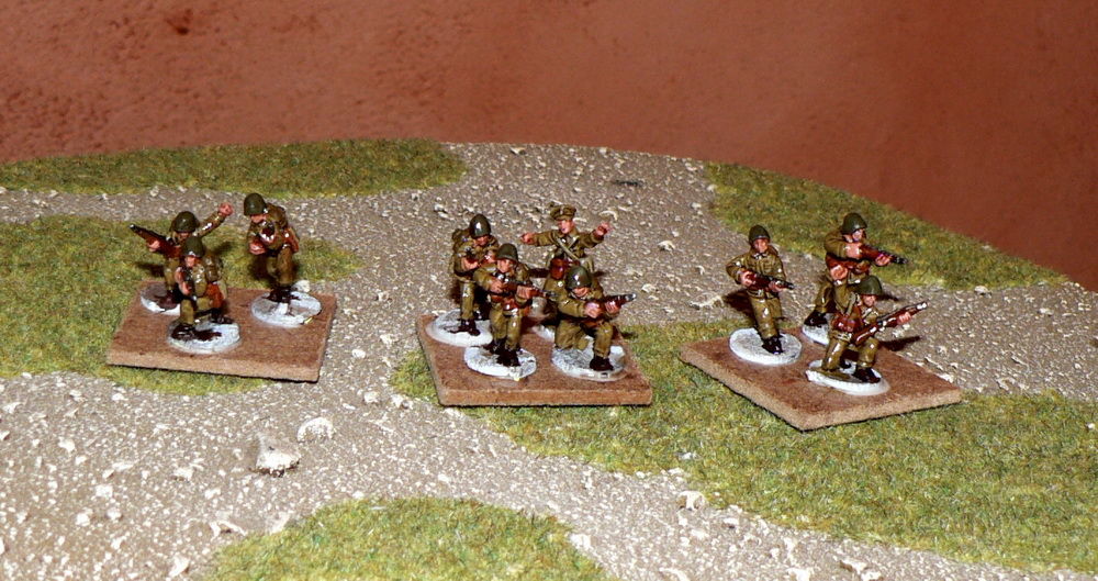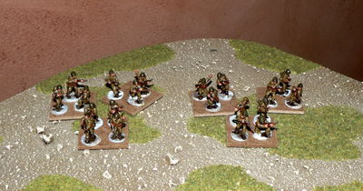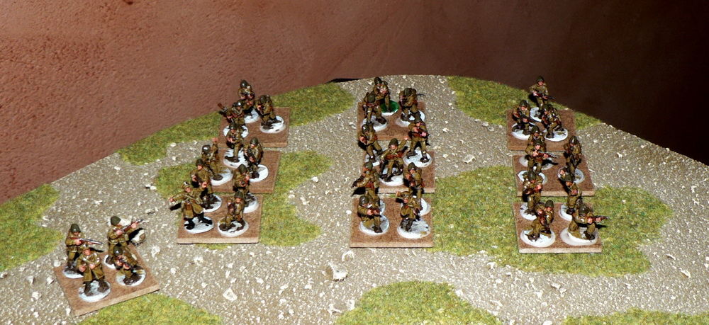 Pour terminer, quelques Hongrois, deux socles de Panzerchreck et un mortier de 81mm. Les figurines des deux plaquettes de gauche sont des Battlefront, alors que le mortier et ses servants sont de marque Legion East (http://www.twotinsoldiers.com/sf60/SearchResult.aspx?CategoryID=5), on voit clairement les différences de taille et de corpulence entre ces deux marques qui rendent impossible le mixage sur une même base.