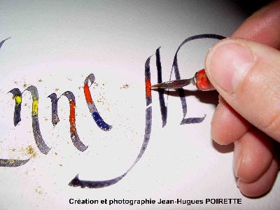 Grâce à la fabrication de mon encre selon un procédé du 13e siècle, sa composition, après modifications secrètes Jean-Hugues POIRETTE, me permet lorsqu'elle est encore à l'état humide sur mon support, d'y ajouter assez rapidement des encres de couleur pigmentées.