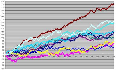 Chaque couleur représente un joueur. On peut voir qu'ils sont tous gagnants sur cet échantillon, mais avec une variance non négligeable.