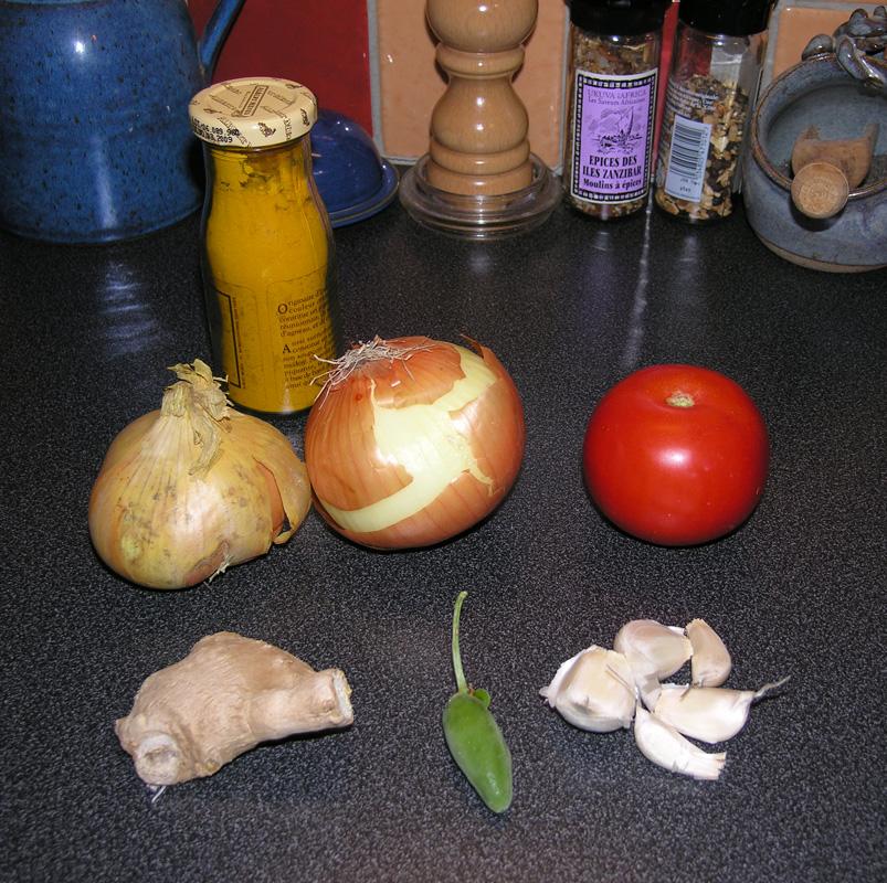 Lorsqu'ils sont bien dorés, rajoutez la tomate coupé en tout petits morceaux, le piment et une cuillère à café de curcuma. Laissez cuire 5mn et rallongez avec de l'eau (pour faire de la sauce). Salez et poivrez. Laissez mijotez un bon quart d'heure en mélangeant de temps en temps.