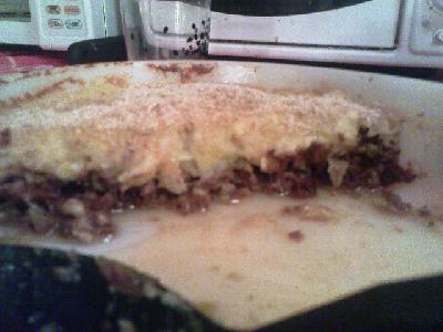 Donc on finit par mettre une couche de poireaux/confit, puis on recouvre de purée qu'on aura bien humidifié de lait pour éviter que ce ne soit trop sec, on soupoudre de chapelure et hop, 30 min au four!