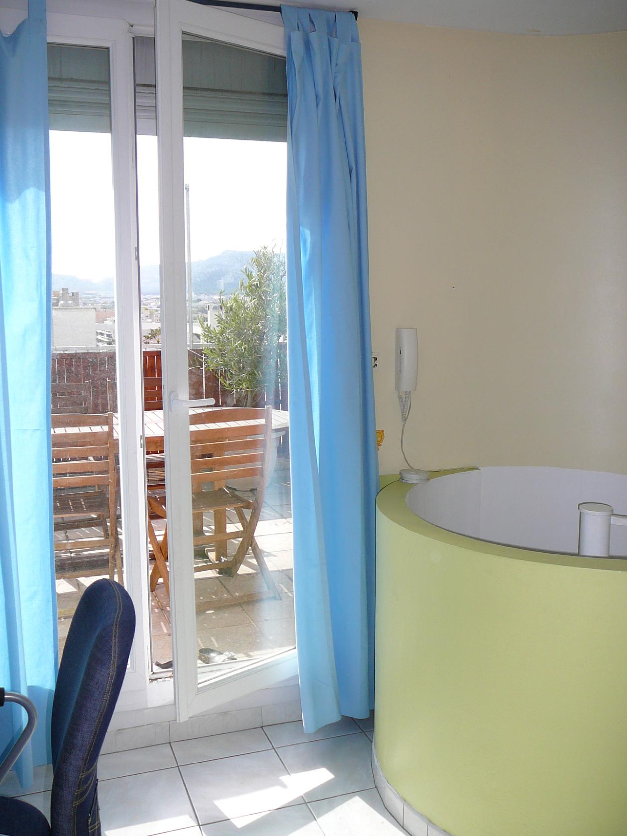 Chambre d'enfant/bureau avec rangement, donnant sur terrasse.