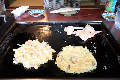 Yokoyama et sa femme passent commande. Nous allons manger un plat traditionnel du Japon : okonomiyaki, sorte de crêpe, constituée de nombreux ingrédients (crevettes, poissons, pieuvre, viande, petits légumes, choux rapé, oeuf battu...) qui nous sont amenés pour que nous les fassions cuire sur la plaque chauffante située au milieu de la table.