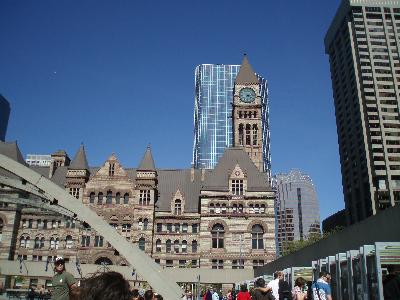 Ce week-end, ce sont les journées portes ouvertes à Toronto, 150 buildings ouvrent leurs portes gratuitement pour découvrir leur intérieur. Cela correspond à nos journées du patrimoine à la seule différence que le patrimoine de Toronto à... une soixantaine d'années !! Je me planifie une petite journée à visiter avec Kattie certains des monuments ; un temps superbe au rendez-vous. Nous commencons par le Dominion Centre, le premier building de Toronto. Après une bonne heure de queue, nous accédons enfin au 54ème étage, qui est normalement un étage de bureaux très classe. Une vue différente de Toronto et de sa CN.