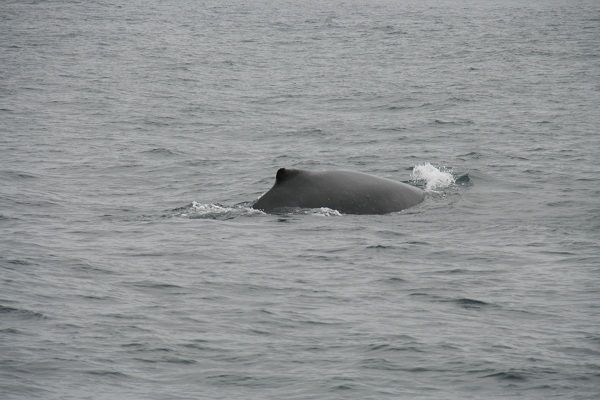 Une fois en mer, après de longues minutes à nous secouer dans tous les sens pour vite s'éloigner du bord, nous entendons la speakerine commencer à s'extasier. On comprend alors qu'il y a des baleines à 9 heures, mais nous ne voyons encore pas grand chose. Puis on commence à voir quelques petites taches blanches dans l'eau grisonnante, on entend un "fffffffffhhh" très grave et là nous apercevons quelques pointes noires percées la surfaces de l'eau. Puis par moment, un gros morceau sort avec un geyzer de vapeur devant et à d'autres l'arrière train se courbe et plonge puis fait ressortir la queue de la baleine qui plonge à son tour. Le spectacle est saisissant d'autant qu'on les approches de plus en plus prêt et que par moment nous en suivont trois à la fois avec toujours ce même balais, le jet d'eau, la nageoire dorsale, le dos rond et la queue en guise de cloture de spectacle. A travers les braillements de notre guide, on pouvait même parfois entendre ce cri sourd des baleines.