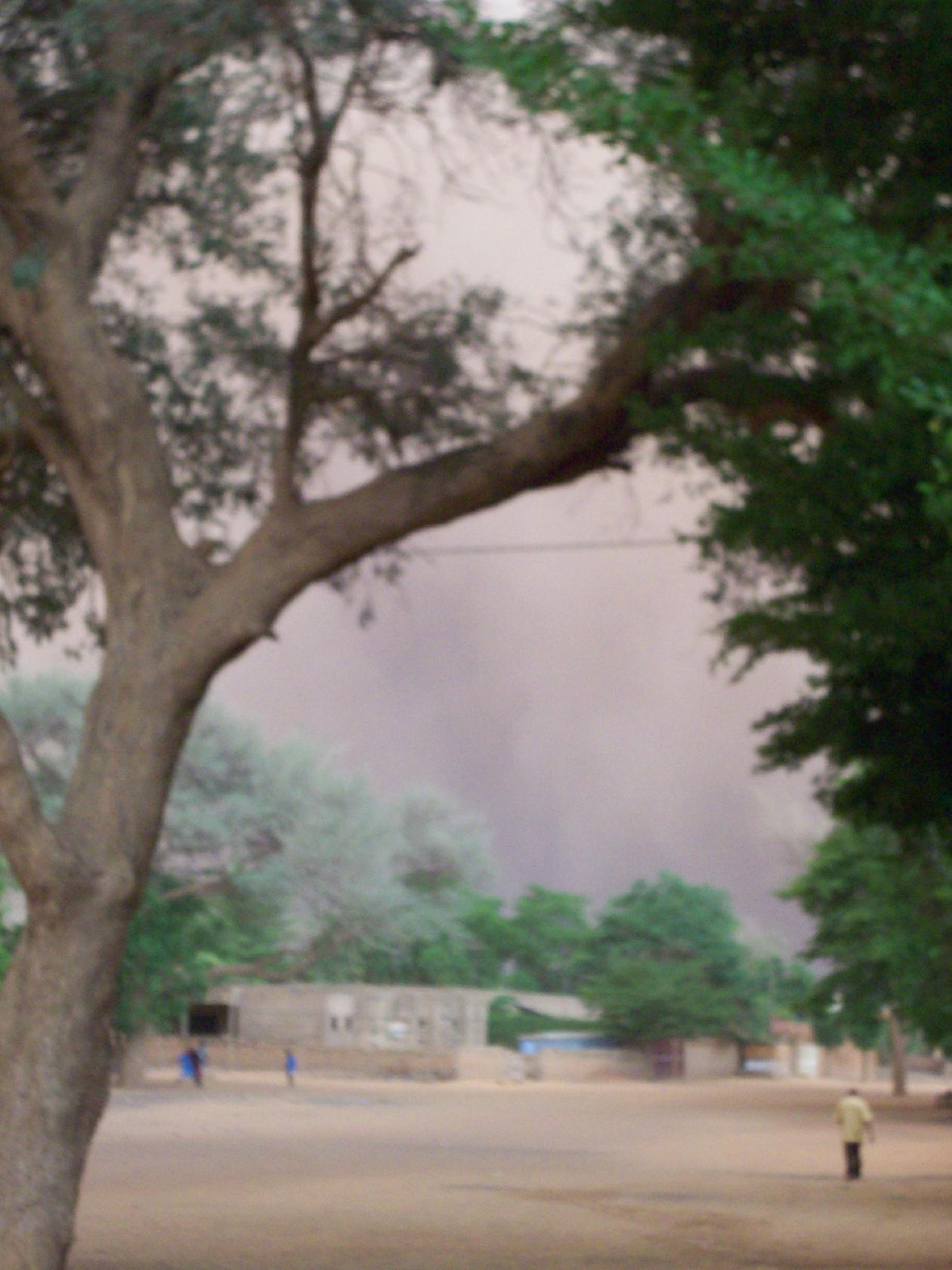 Bon, franchement, c'est impressionnant comment ça arrive. Il fait beau et chaud (plutôt très lourd), et d'un coup d'un seul, le vent arrive, tempête de sable, tout devient noir et, le drame, il pleut des cordes...mais pas des cordelettes, attention, de la vraie grosse pluie qui te trempe en 2 secondes.