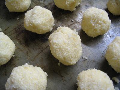 Eteindre le four, de cette façon les boules ne s'escagasseront* pas. Prendre ses deux yeux et surveiller un peu tout de même, il faut connaitre "son" four. Pour le mien il faut 17 à 20 minutes. Lorsque le dessus dore un peu, sortir et laisser un peu "sécher" S'attacher les mains dans le dos et juste les regarder amoureusement, autrement petit diabète deviendra grand. Prendre la voiture et allez troquer vos boules à la coco , "mais non pas la poudre à la papaille des petits sachets blancs que vos enfant ont ramenés de Colombie", contre quelques oeufs de vraies poules de campagne