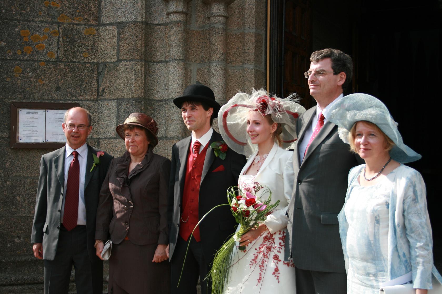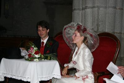 L'évolution des moeurs étant ce qu'elle est, on n'échange plus les alliances de nos jours, mais bien les chapeaux...drôles d'oiseaux ces bretons! Si vous faite attention vous remarquerez qu'on s'est tous plus ou moins assortis à la magnifique robe de la mariée: vive le bordeaux!