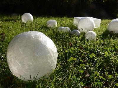 L'Artsouille a profité de Couleurs du Temps (l'ouverture des ateliers d'artiste) pour dévoiler sa dernière création en simultanée dans deux lieux différents. Née du hasard des expérimentations et inspirée par le land art, Univers Aléatoires / Électrons libres fait fi des figures humaines, ouvre de nouveaux horizons et nous donne des envies d'extérieur. Des cocons de forme géométrique, de tailles diverses, une œuvre aléatoire et évolutive, sensible aux changements de lumière, des volumes dont la perception varie selon la position du spectateur. Tantôt poétique et lunaire, tantôt pragmatique et terrienne, une œuvre toute de transparence et de légèreté comme il se doit.