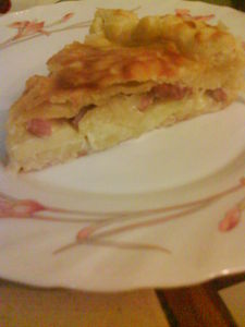 Dans un moule à tarte, mettre une pâte feuilleté et piqué le fond avec une fourchette, couper les pommes de terre en rondelles et les ajouter sur la pâte, enfin mettre le mélange lardons/oignon sur les pommes de terre.