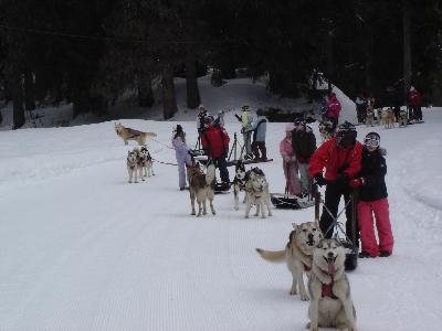 Nous voici sur nos traîneaux dans la forêt ,en train de nous chamailler pour conduire le traîneau …