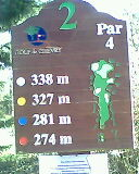 Trou N°2 , je pars des boules blanches (338 métres) c´est un Par 4 (donc à faire en 4 coups) et il est très bien défendu par des bunkers.