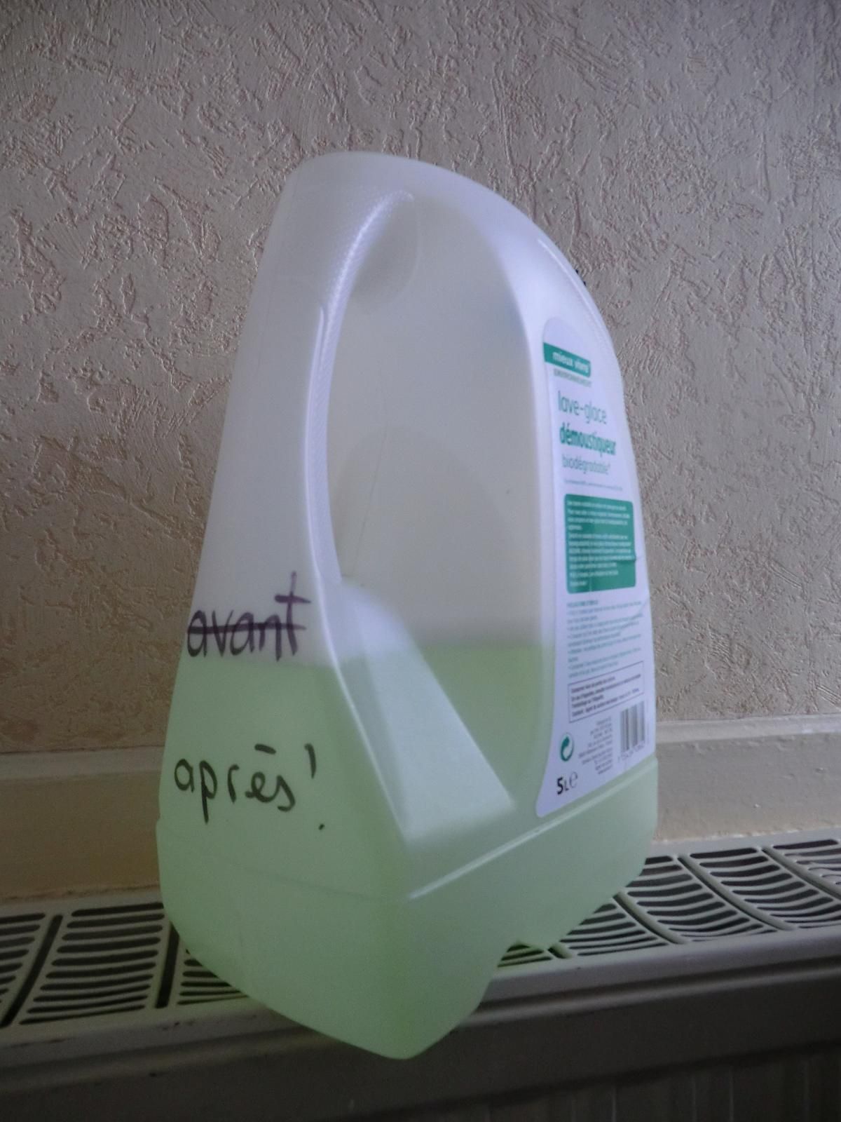 Résultat, pour cette fois-ci, je peux à nouveau remplir mon réservoir sans avoir à acheter un nouveau bidon, et mon produit, tout en restant efficace, sera un peu moins polluant.