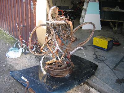 Lors d'une sortie en forêt afin de nettoyer la nature , les enfants de l'école élémentaire ont récolté des déchets de toutes sortes . Parmi ces déchets , de nombreux vélos et parties de cycles nous ont donné l'idée de travailler comme les nouveaux réalistes des années 1950. Grâce à la compétence de Michel , soudeur , nous avons pu mettre notre projet à exécution. En voici les étapes de créations et le résultat avant peinture .