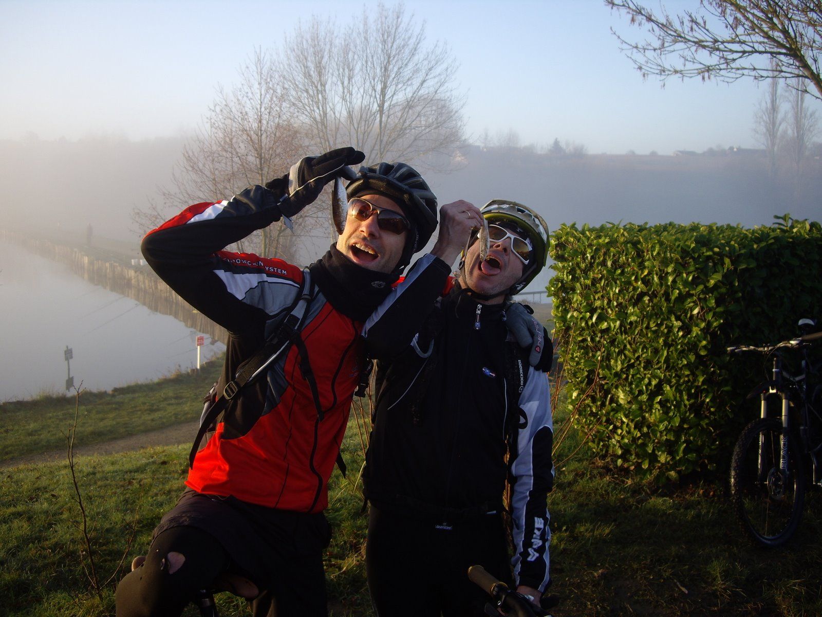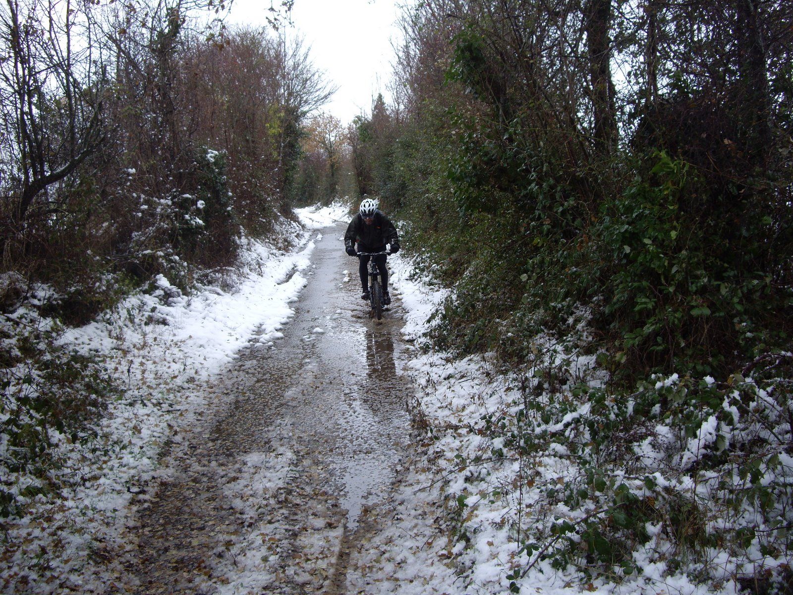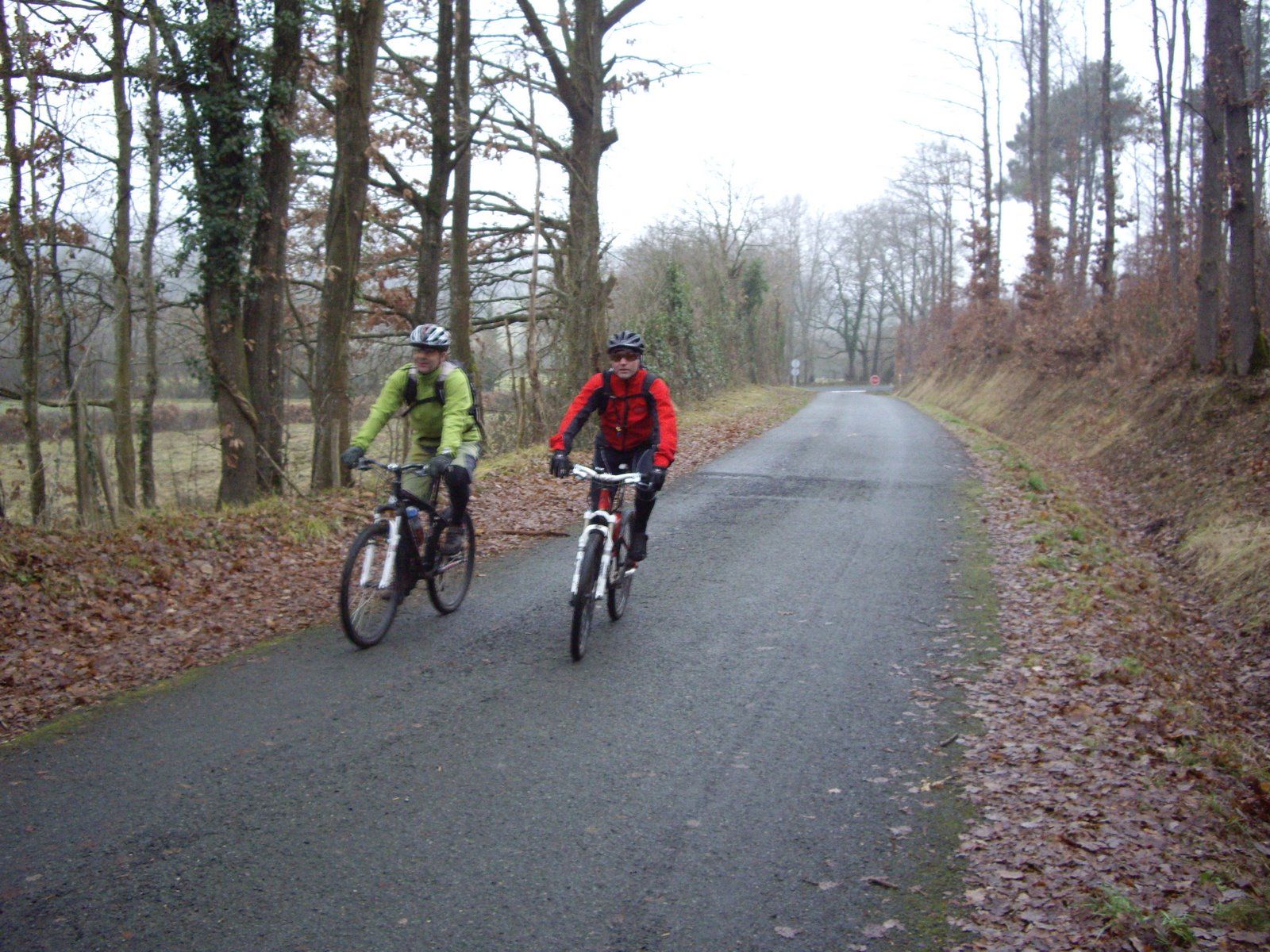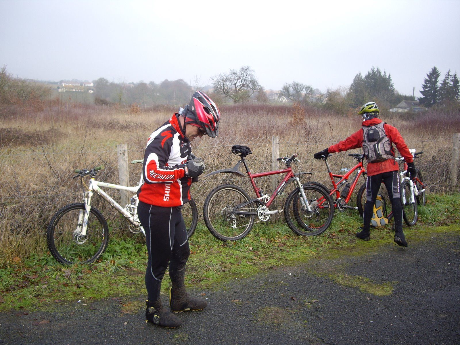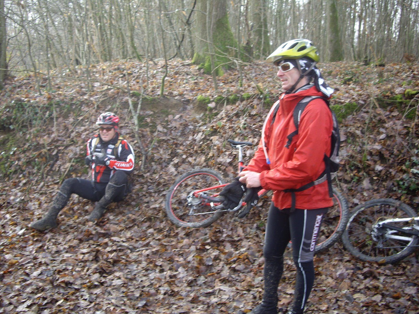 Pas très courageux, pas beaucoup de partants non plus, pas énormément de temps devant nous....voila qui augurait d'une sortie tranquille...surtout vu l'épisode de froid et de neige qui précéda ce we (en novembre ma bonne dame, y a plus de saison). Bon faut aussi relativiser, j'ai vu dans le journal que la sibérie était descendue à -47° et un peu plus loin à -51°...ça laisse pantois! Bon en même temps je ne crois pas qu'il fasse du vtt la bas!!!!