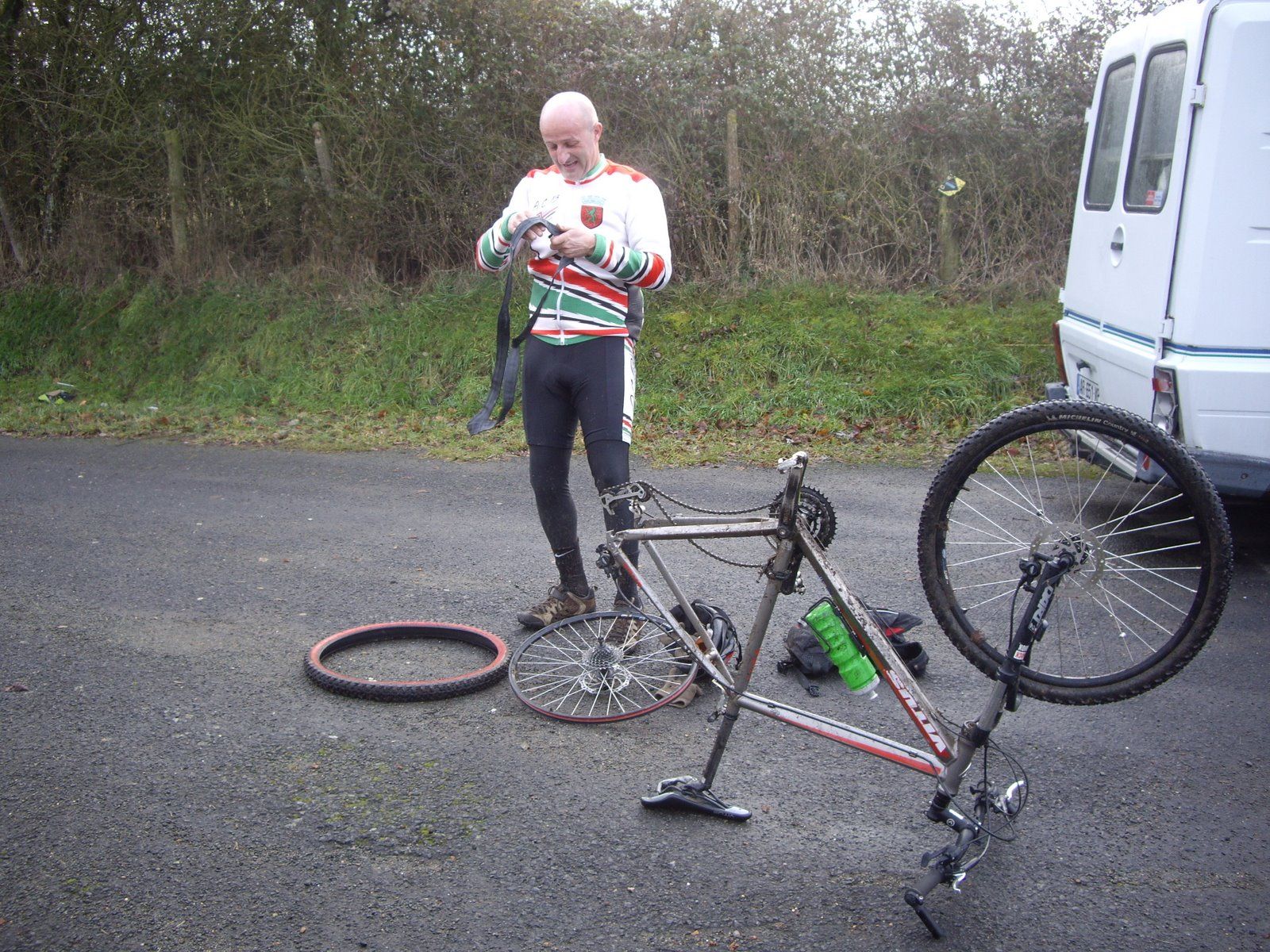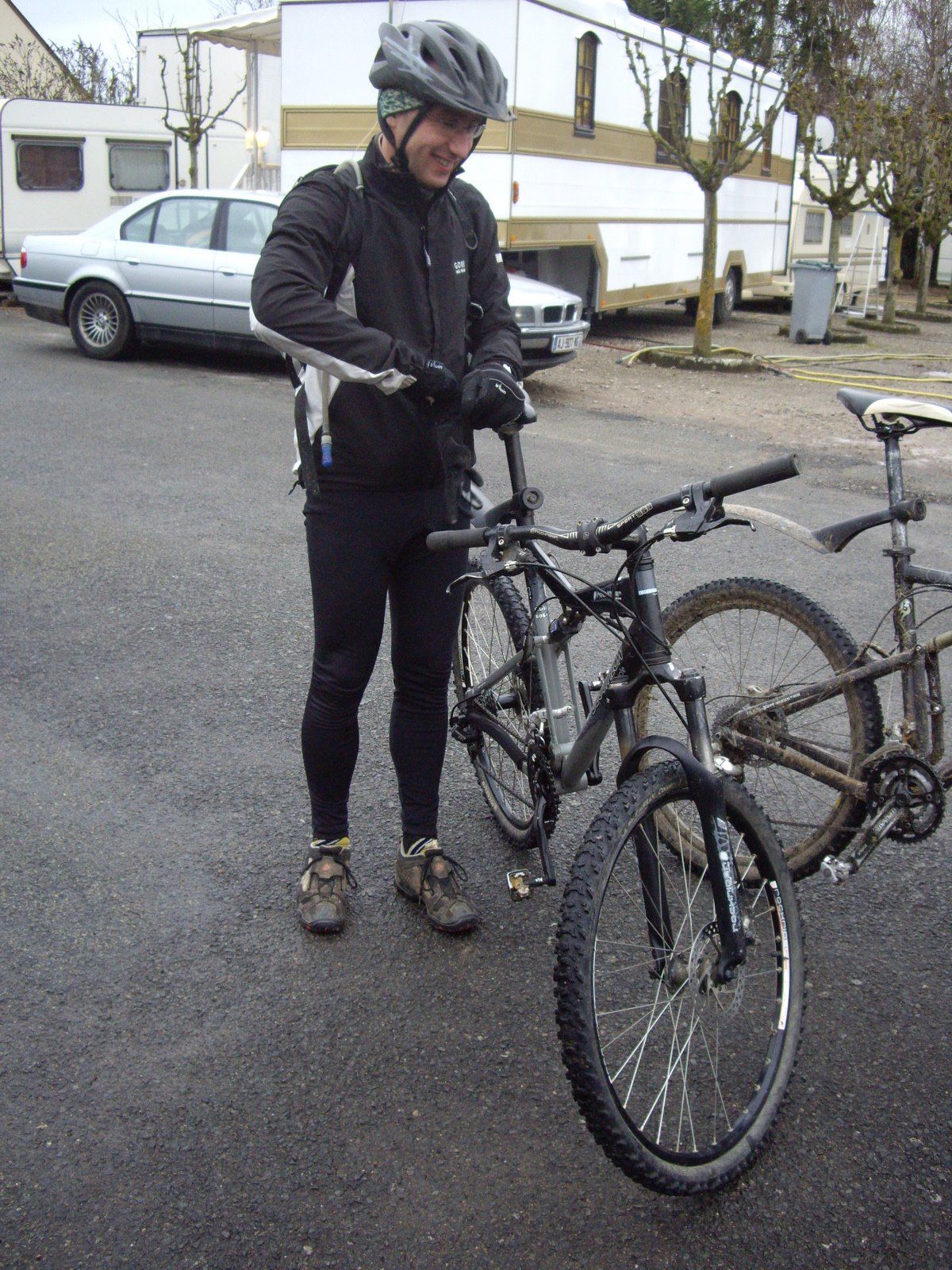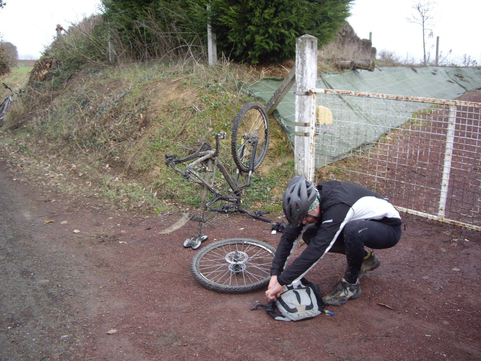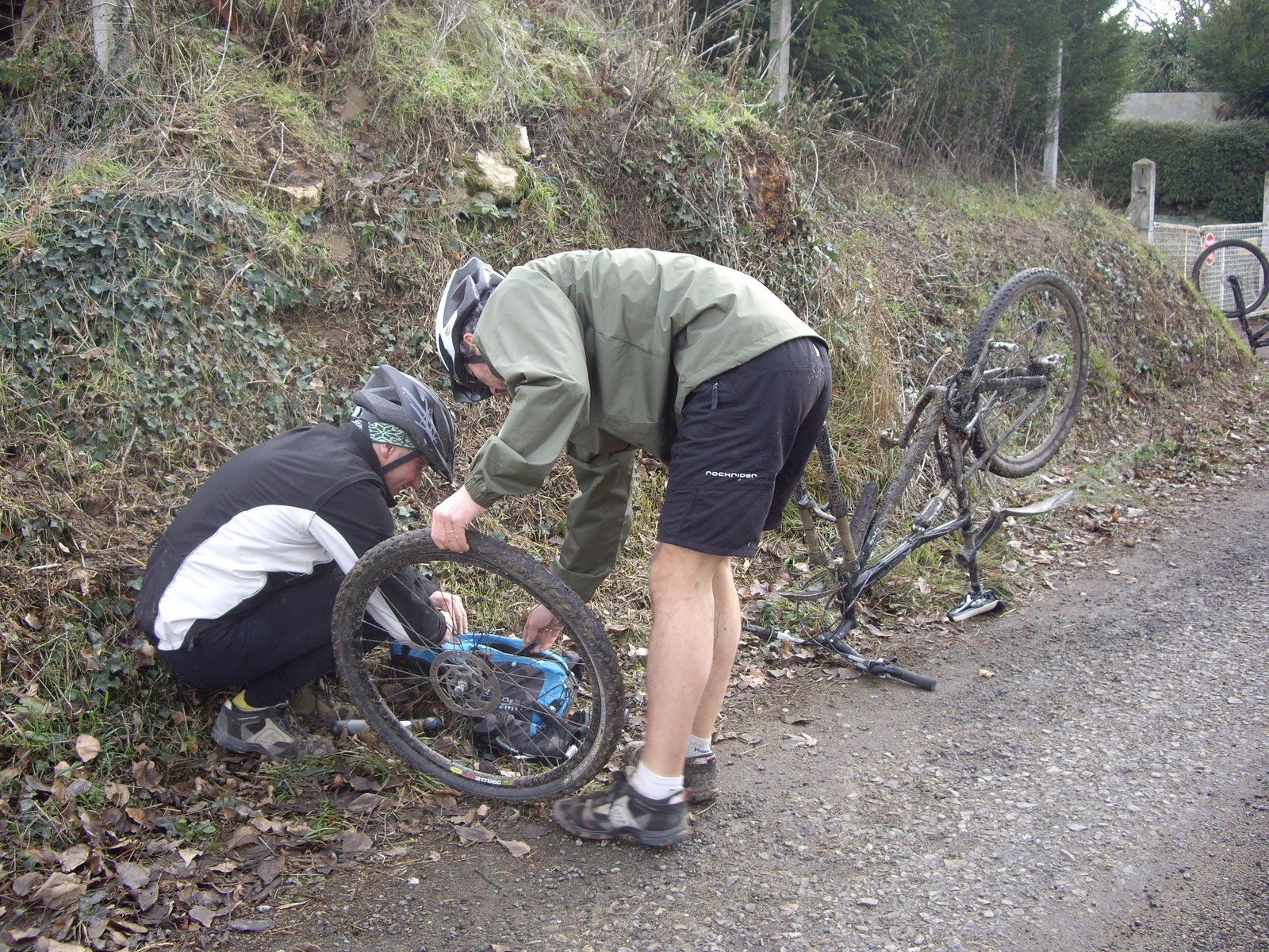 Va falloir acheter des vrais pneus de vtt, Thierry! Mais un peu d'aide du Bull (il aime bien aider sur les crevaisons...hein les filles? Cf le blog de Mika!)