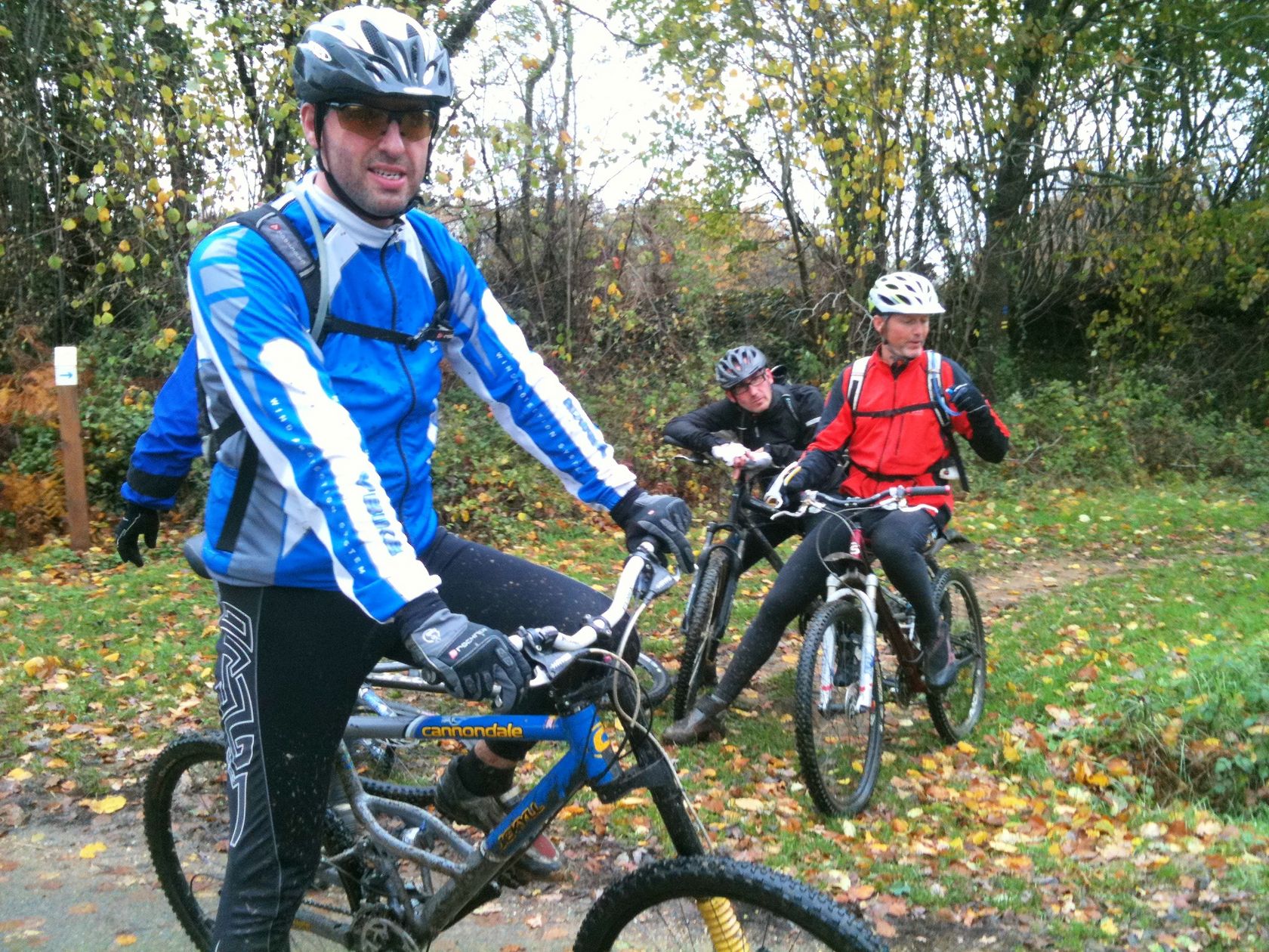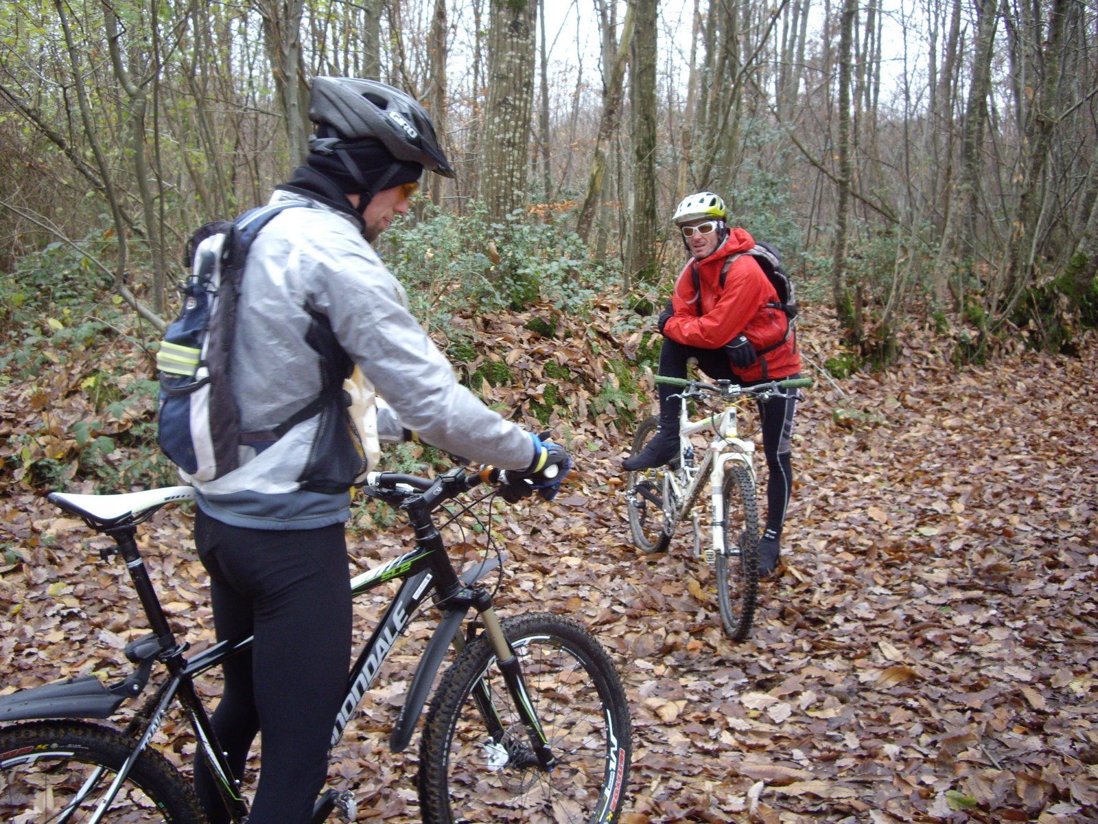 Comme d'hab, Hugo ne s'est pas levé et c'est donc seul et l'ame en peine que je me rendis au point de rv habituel. Et la au bout d'un quart d'heure ou je commençais à maugréer (merde, j'ai vraiment besoin de cette thérapie!) après avoir effectuer 5 tours d'étangs (oui 4kms!), je vis arriver la surprise, enfin je devrais dire, LES SURPRISES. Car le Bull n'était pas le seul à avoir un beau vtt, Non le Bleu (Greg) affichait aussi fièrement sa monture de chez Cannondale!
