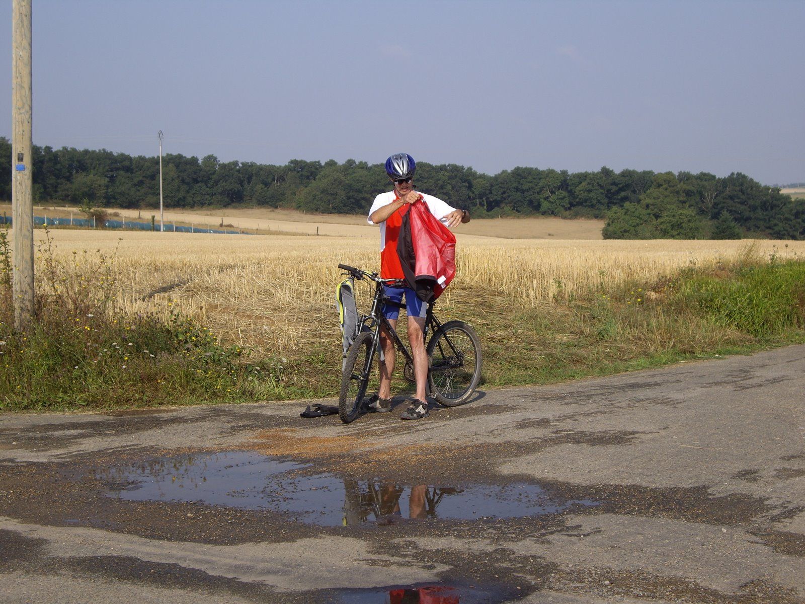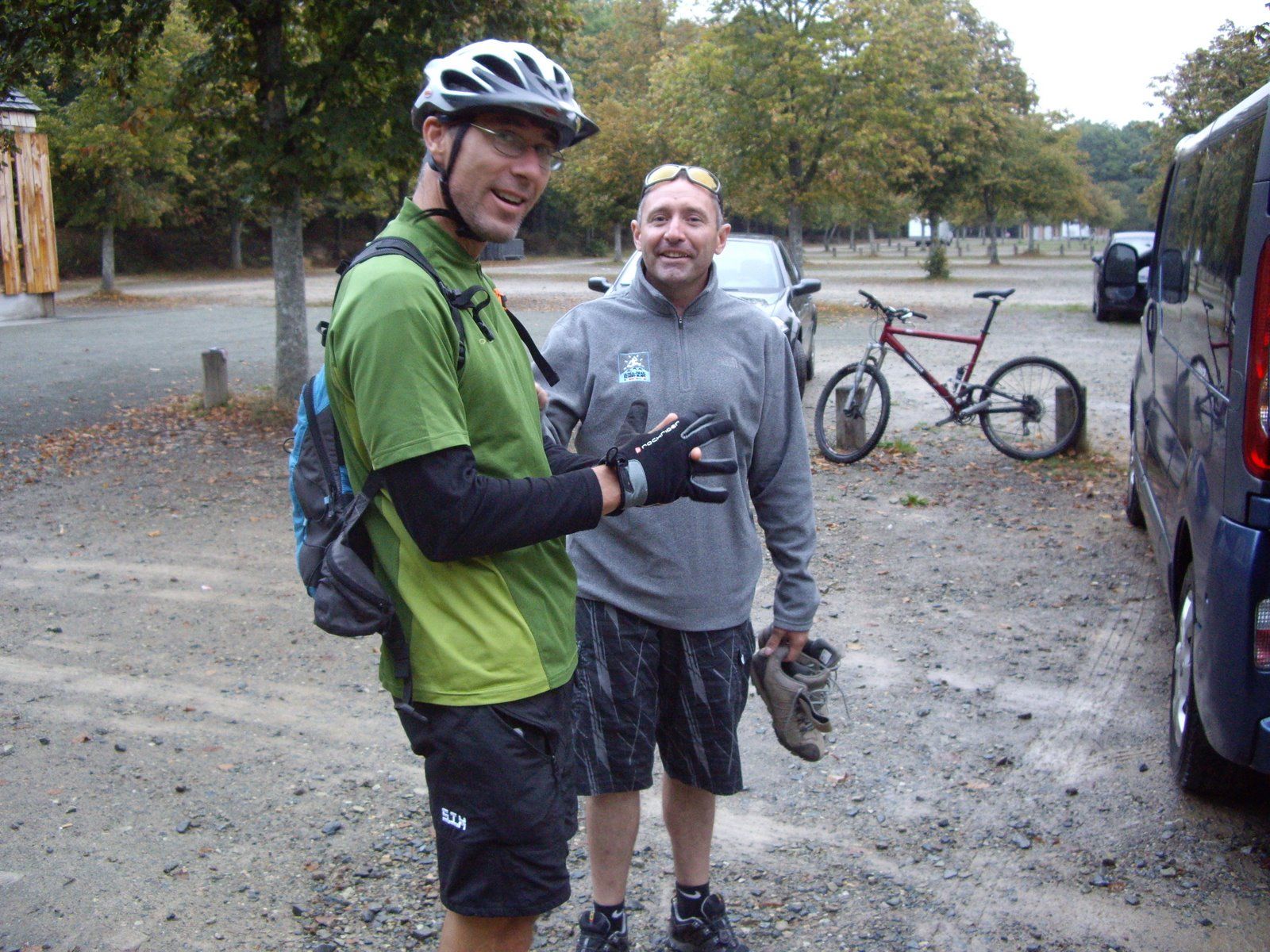 Nous voila donc en partance pour un parcours de 30 bornes à Fresnay avec gégé (l'homme au 3 crevaisons du raid Yadutaf)..et Pika. Mais un indice nous mets la puce à l'oreille: à 9h15 (rv à 9h) toujours pas de Pika! Oh oh. On se pointe chez lui et la le pépère, il n'avait pas lu ses mails, et son portable (avec lequel il communique , était déchargé! Comme par Hasard!) Donc la seule phot que j'ai de lui est celle la: