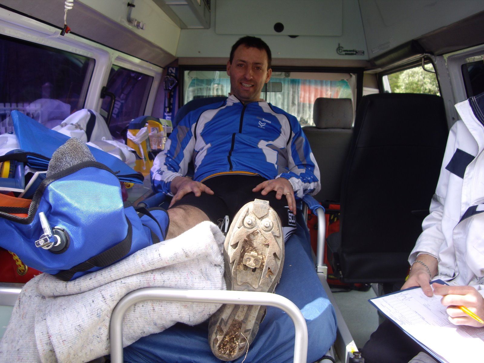 Qui comble de malchance, n'est pas passé assez prèt de la pub vttmag (pas prèt de se retrouver dans ce mag!).La sentance tombe: Nafnaf s'est fait mal et rentre en ambulance.