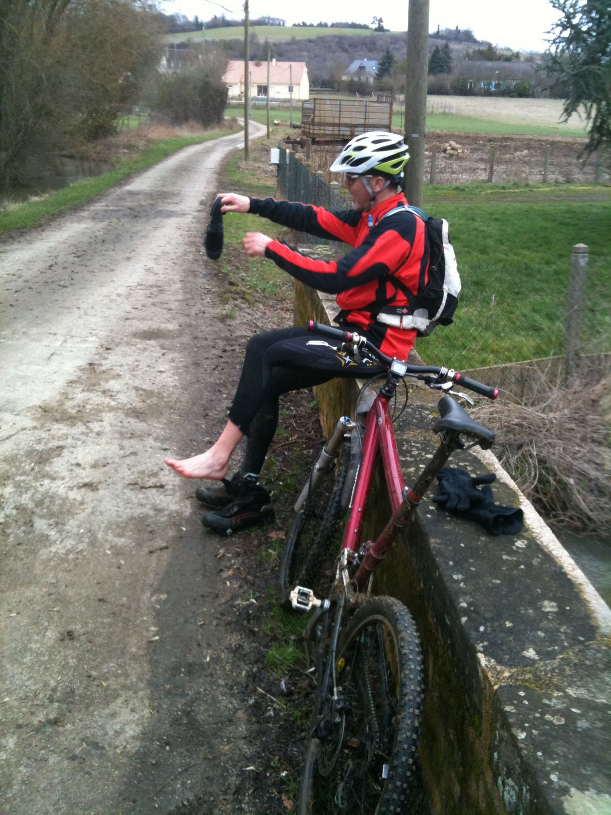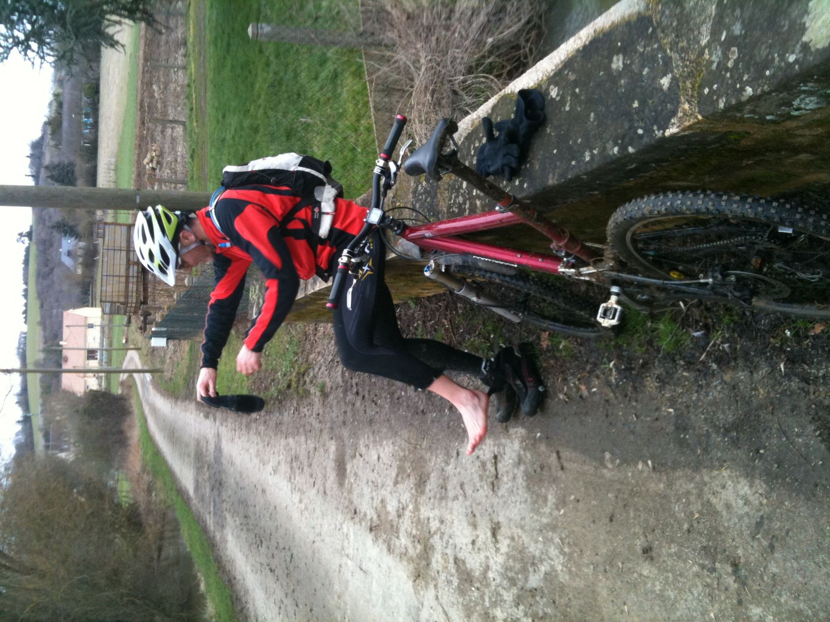 . C'est d'ailleurs dans ce passage que j'ai fait ma plus belle erreur...malgré les conseils avisés de Steph qui était déja passé par la la semaine dernière et a donc fait demi tour! Moi j'ai voulu continuer la descente ...erreur arrivée très humide (c'est un euphémisme). Dans le chemin je décidais de rouler dans l'herbe au milieu (enfin ou je croyais qu'elle était car je ne la voyais pas!). Résultat: pas de photos (censuré!), mais un bon bain de pied (voir de jambe!!!) et obligé d'essorer mais chaussettes. Car encore une fois mes chaussures imperméable c'est bien, mais quand l'eau est rentrée....elle ne ressort pas très vite! Et là, il m'aurait fallu des cuissardes à la mode ostréiculteur!