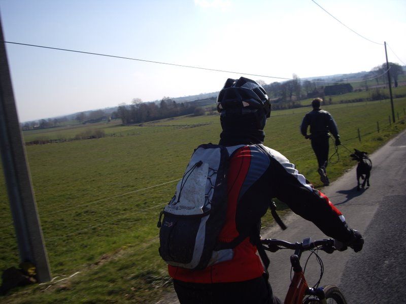 Avec de bonnes petites cotes...bien grasses et un peu de route (l'image résume bien la sortie!). Mais assez vite le temps s'est gaté(c'était trop beau!) et nous avons fini sous la pluie après 31 kms.