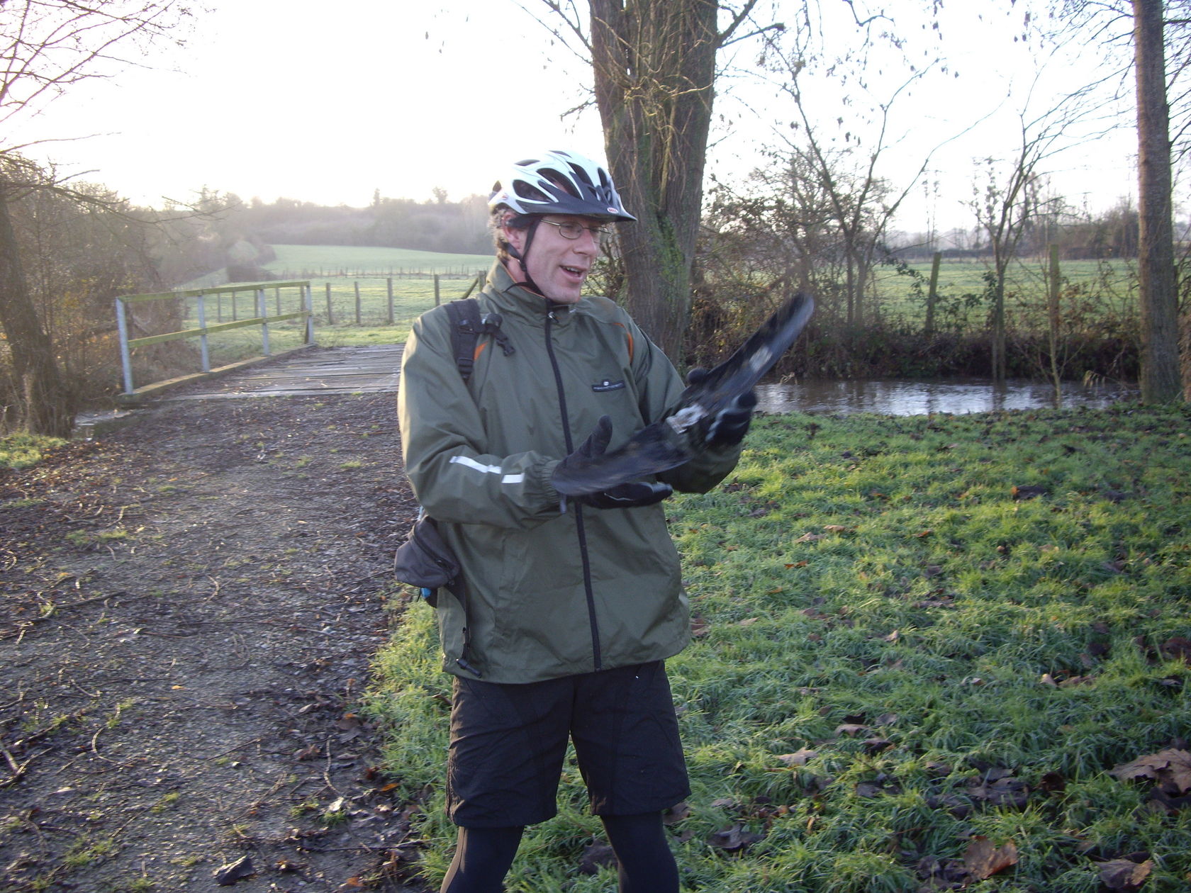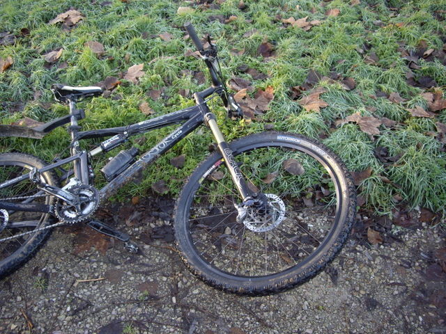 Je fais alors demi tour pour et là, stupeur, encore une photo loupée, et qui aurait pu être diffusée dans VTT MAG, mon Vomito en train de barboter dans une autre flaque, gelée celle là aussi.