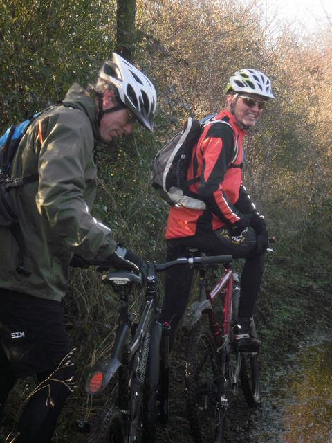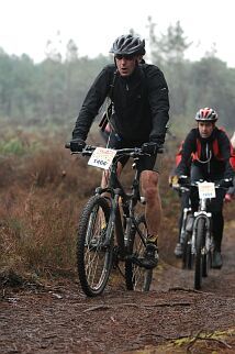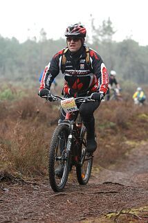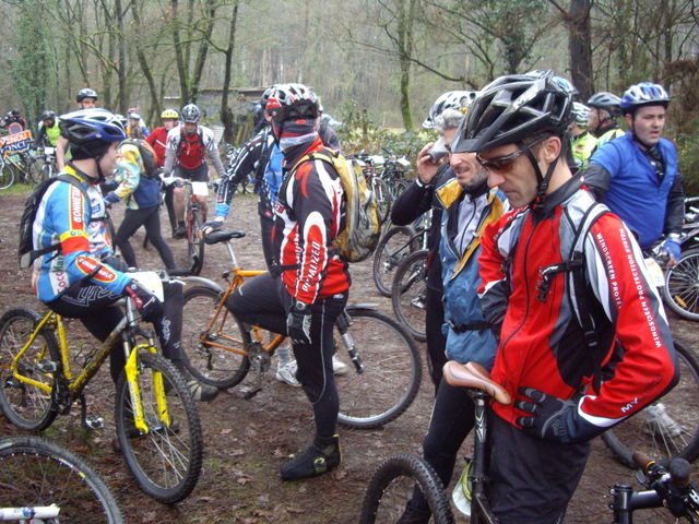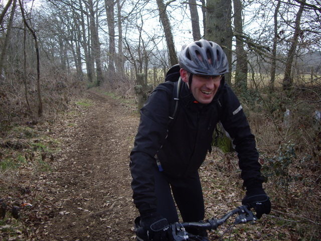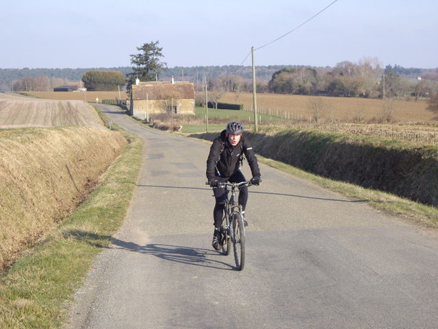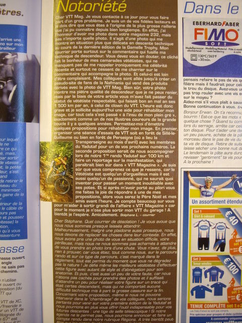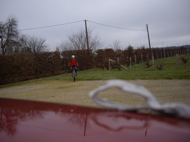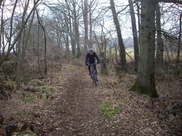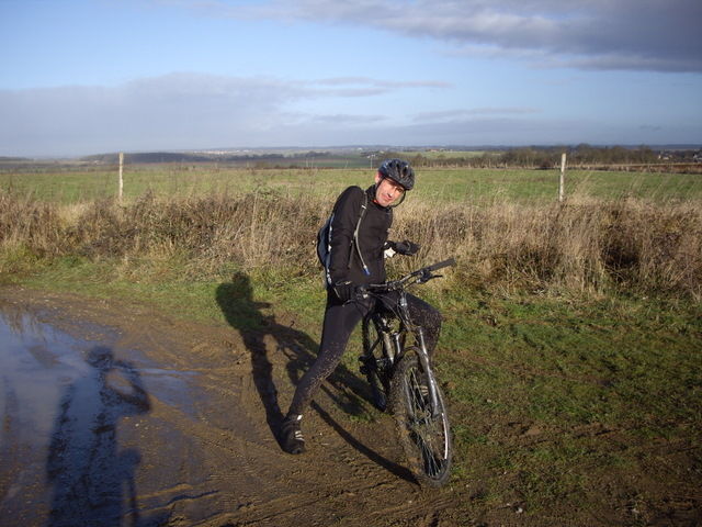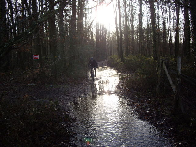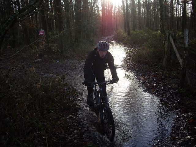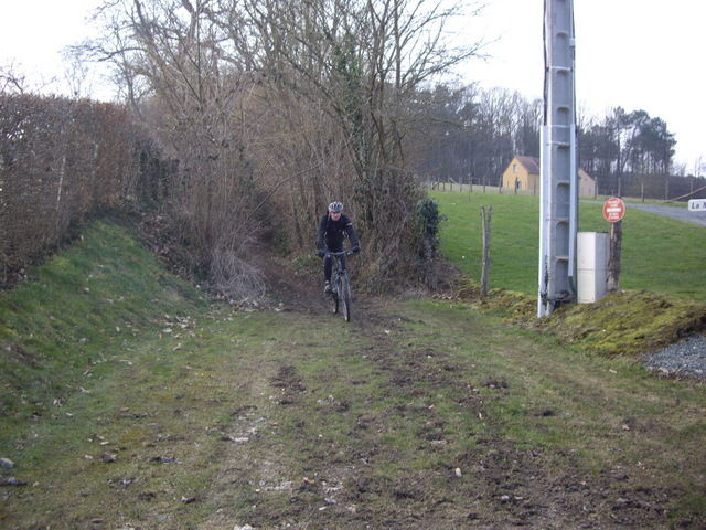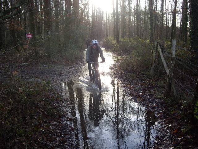 Fallait bien que j'y passe aussi! Même si j'étais la incognito (sans le maillot orange attendu par tous les reporters de vtt mag!). Obligé de se mettre en danseuse pour un petit monticule tout pourri...car j'étais obligé de garder le petit pignon pour suivre sur le plat. Cependant cette photo vaut son pesant d'or pour 2 raisons: