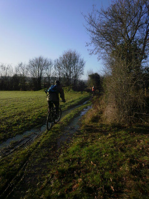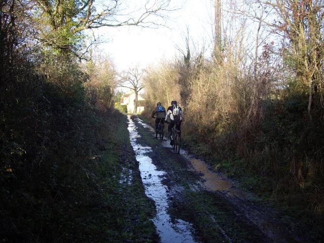 Alors que comme d'hab j'en ch....., sur des chemins blanchis par le froid, il a fallu contourner un chemin impraticable, par un champ. Donc nous voilà partis, sauf évidemment Vomito qui, je le voyais, cherchait à se faire remarquer par tous les moyens, notamment en passant quand même par ce fameux chemin.