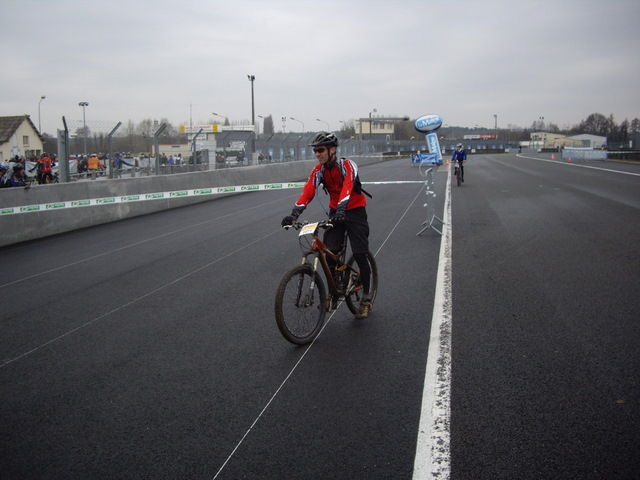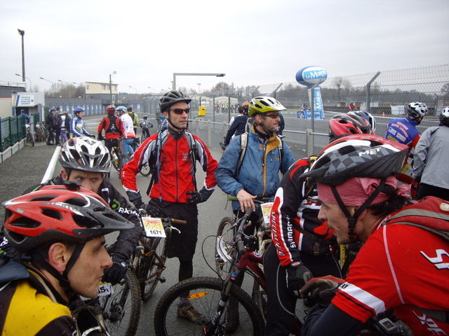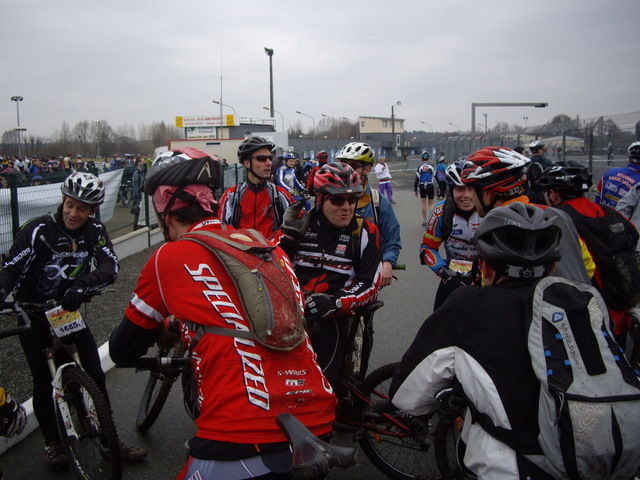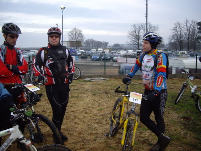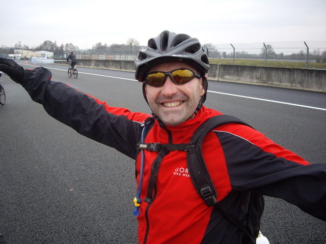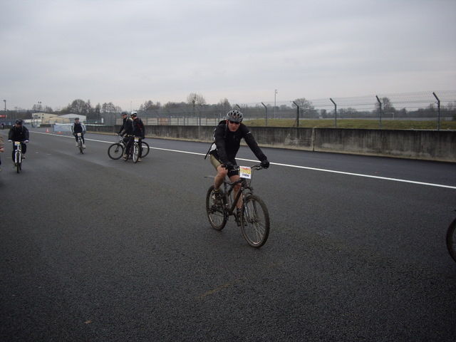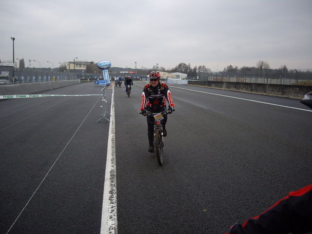 D'un commun accord tous les participants décident d'enterrer le hache de guerre...mais certains ont bien du mal à tenir en place!!! Et ce qui devait arriver arriva! Après 3 kms peinards, les 12 derniers allaient repartir de plus belle, avec une apothéose sur le circuit, ou Olive bien en jambe luttait seul contre le vent à la poursuite d'un Willy retrouvé, pendant que Jérome (qui a eu pitié de moi) me ramenait sur la tête, tentant même de me lancer en sprint!!! Soit j'ai réussis à garder sa roue, mais quand j'ai passé le nez à la fenètre...j'ai failli reculer! Heureusement qu'il a freiné pour me laisser passer! Là j'ai fait 30m face au vent...et je suis rentré dans le rang!!!!!!!! Heureusement le vin chaud de l'arrivée allait retaper tout le monde.