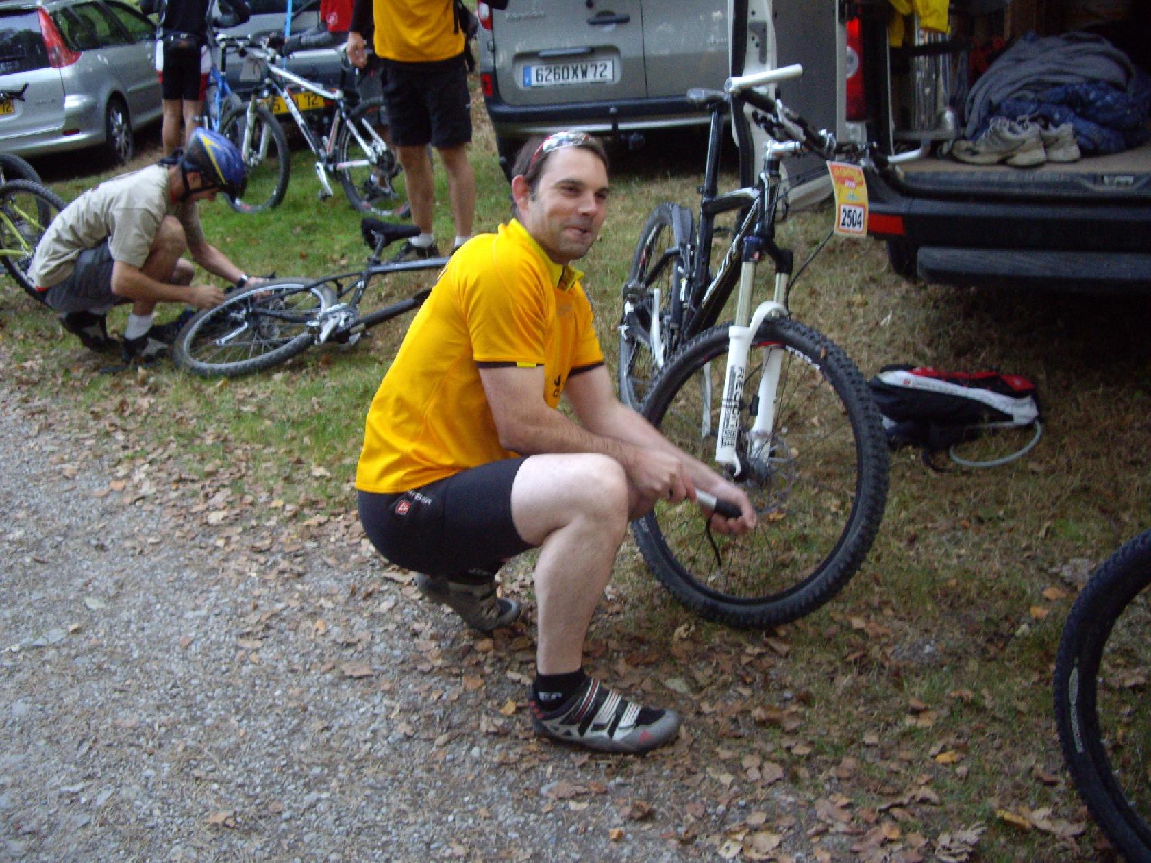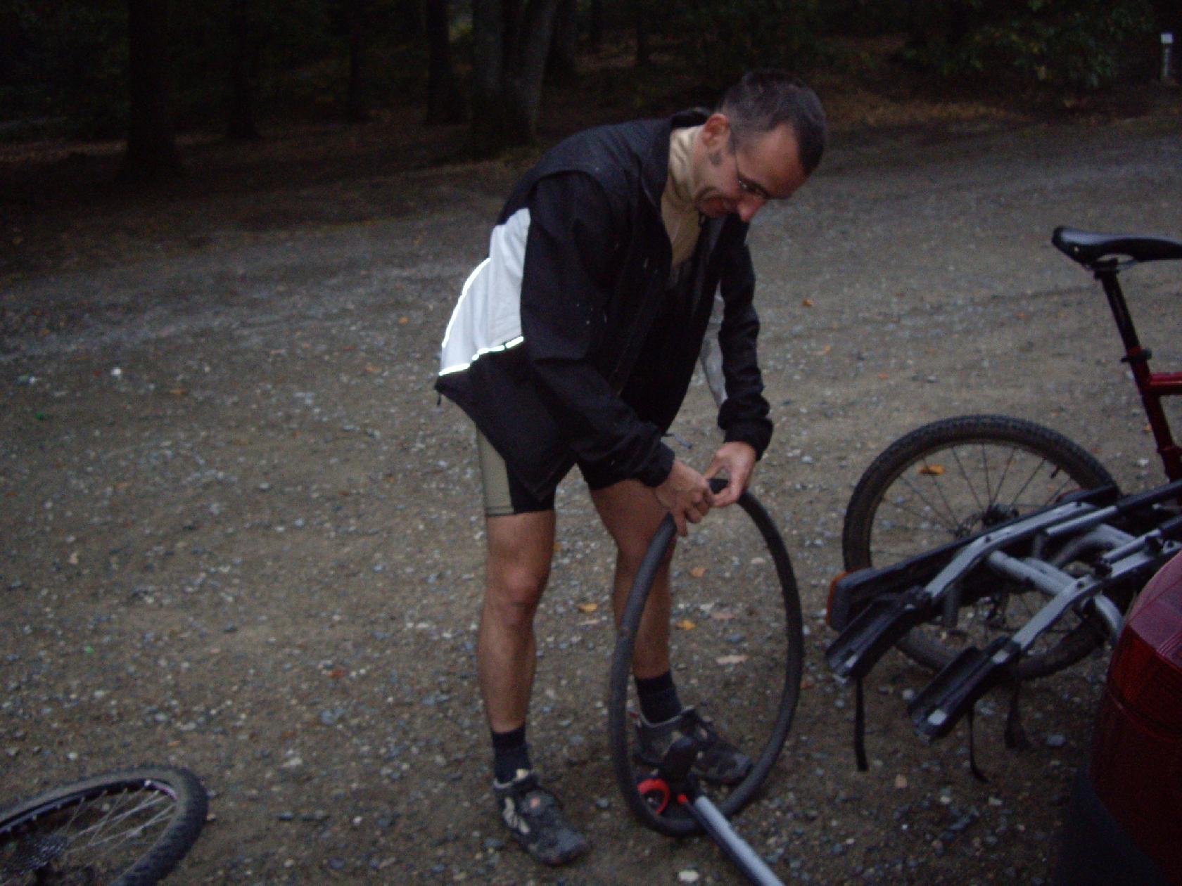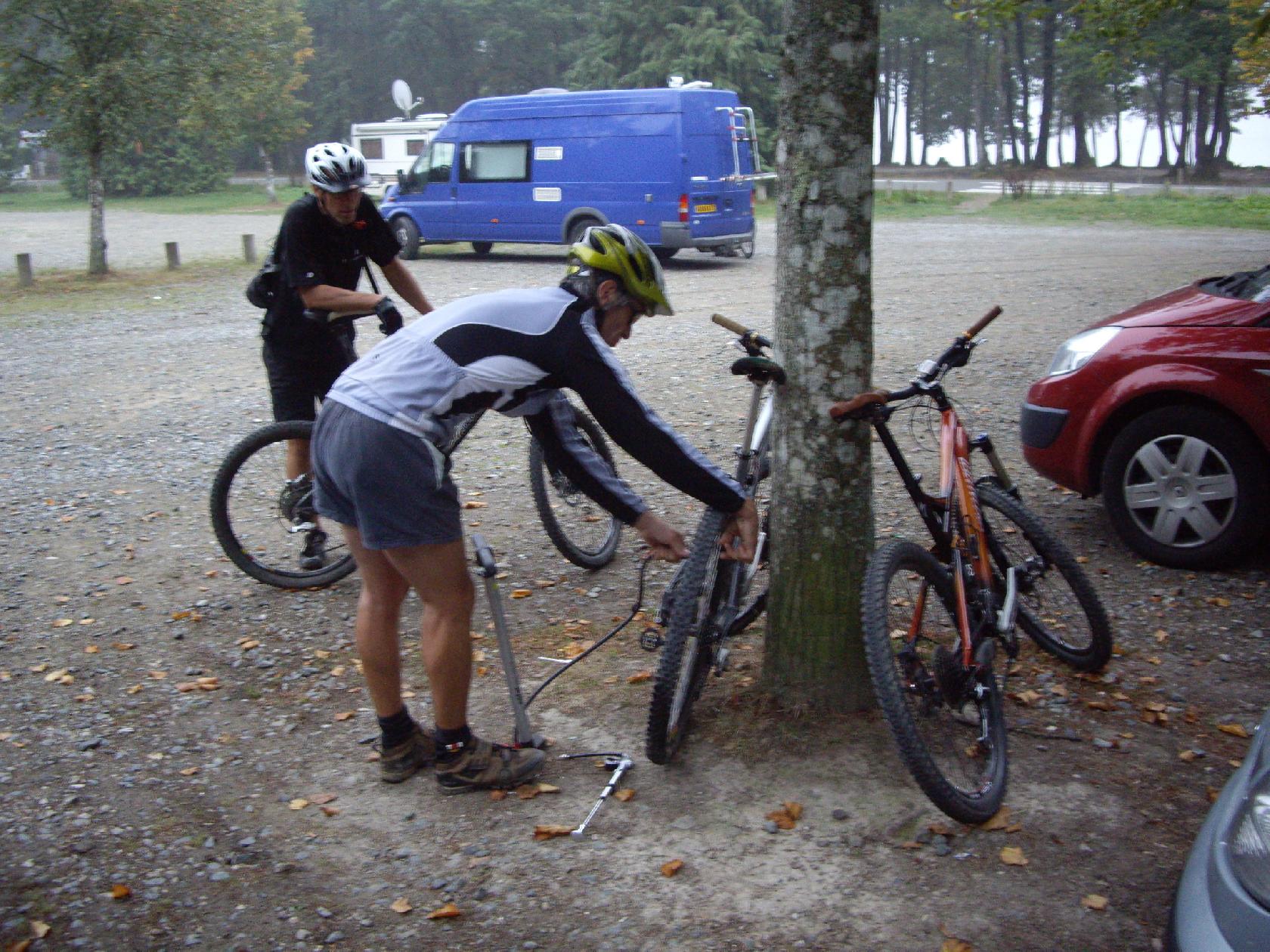 En même temps, quitte à avoir une crevaison, autant que ce soit sur le parking ou la pompe à pied nous rend service! Certains en profitent d'ailleurs pour regonfler leur matos...si bien entretenu!
