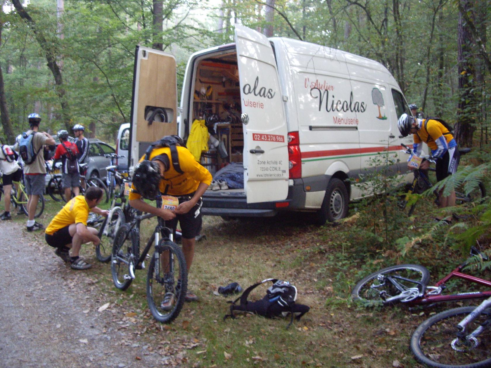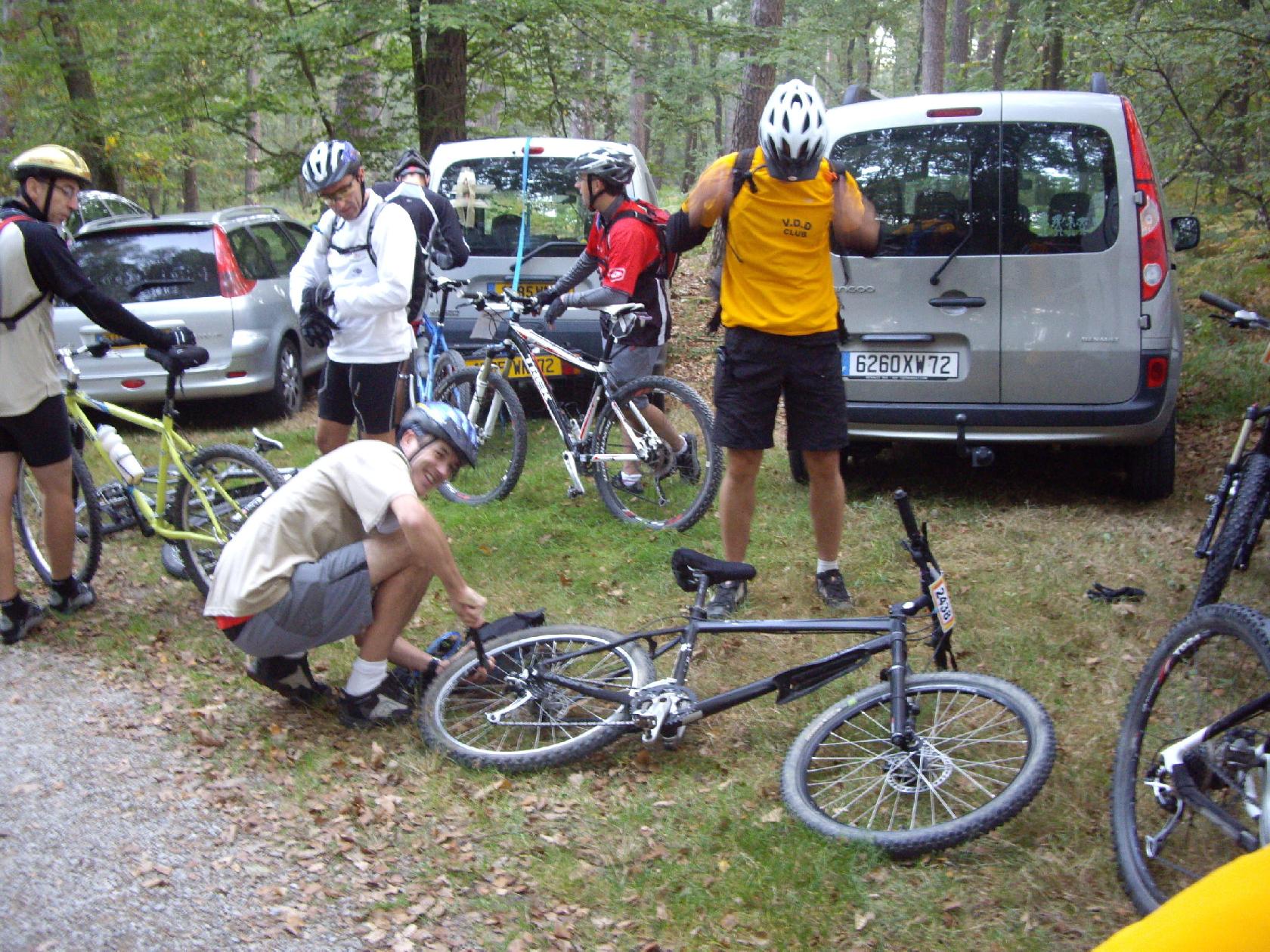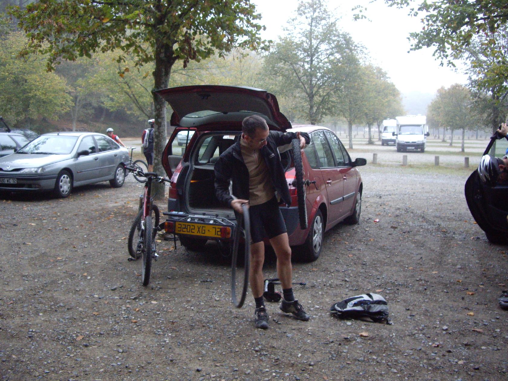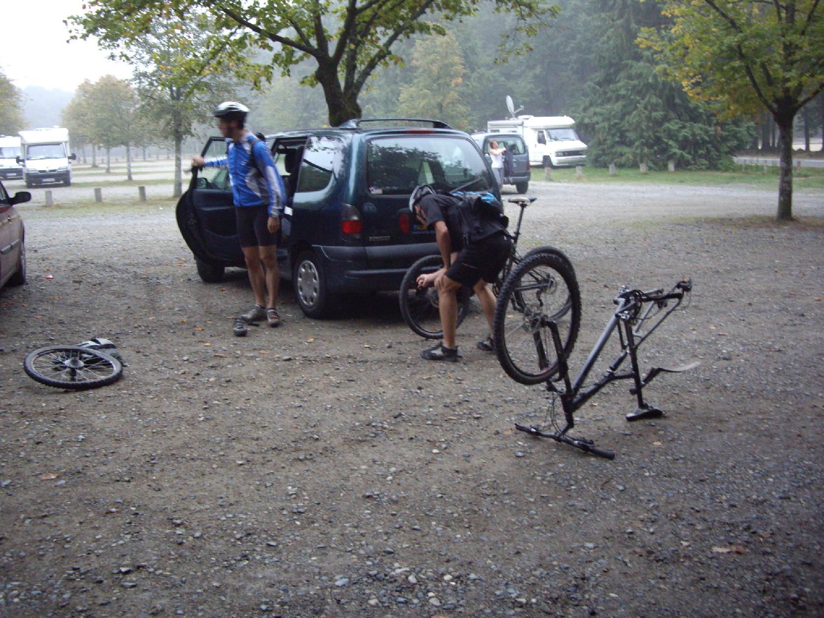 En même temps, quitte à avoir une crevaison, autant que ce soit sur le parking ou la pompe à pied nous rend service! Certains en profitent d'ailleurs pour regonfler leur matos...si bien entretenu!