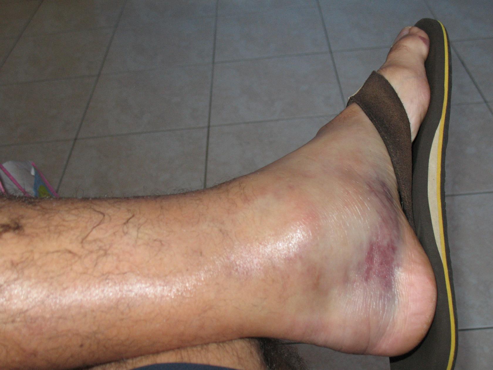 Pour ceux qui n'auraient pas vomi sur leur écran, suite à la vue de cette image, sachez tout de même qu'il s'agit d'une cheville...gauche (merci la tong qui permet de penser qu'on est proche du pied...) et que l'heureux possesseur de ce spécimen remarche ce jour.
