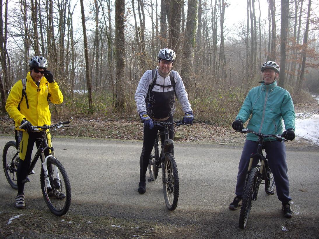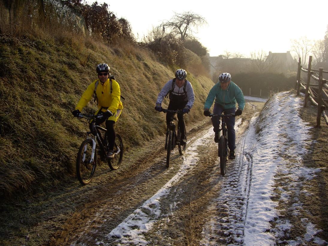 On avait de quoi y aller la fleur au fusil! Mais au lieu de ça, on a fait 42 kms (un marathon...en vtt, soit, mais un marathon quand même!), à essayer de suivre un Bull retrouvé dès qu'il eut passé sa crevaison habituelle (les années se suivent et se ressemblent, Dom!!!) ...après 1,5kms!!!! Le tout dans un froid plus que glacial qui avait eu raison de notre Crampman national...pourtant vacciné contre la grippe!